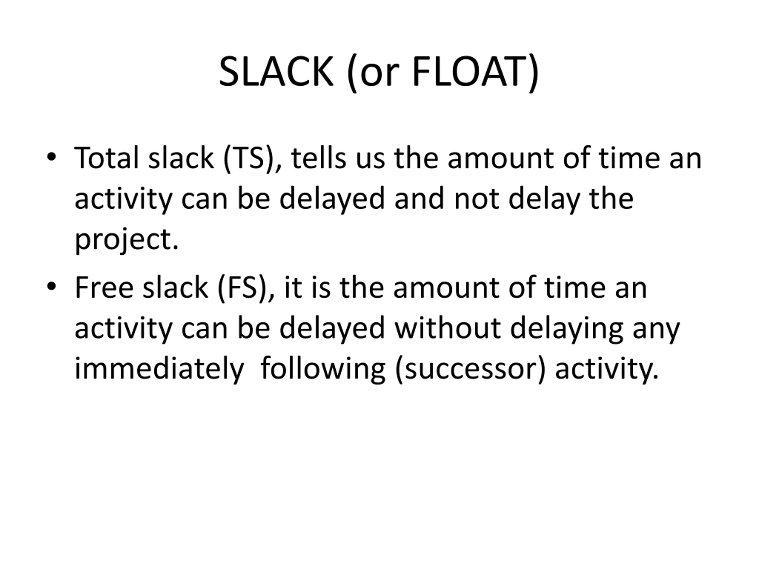 SLACK (or FLOAT) Total slack (TS), tells us the amount of time an activity can be delayed and not delay the project. Free slack (FS), it is the amount of time an activity can be delayed without delaying any immediately following (successor) activity.