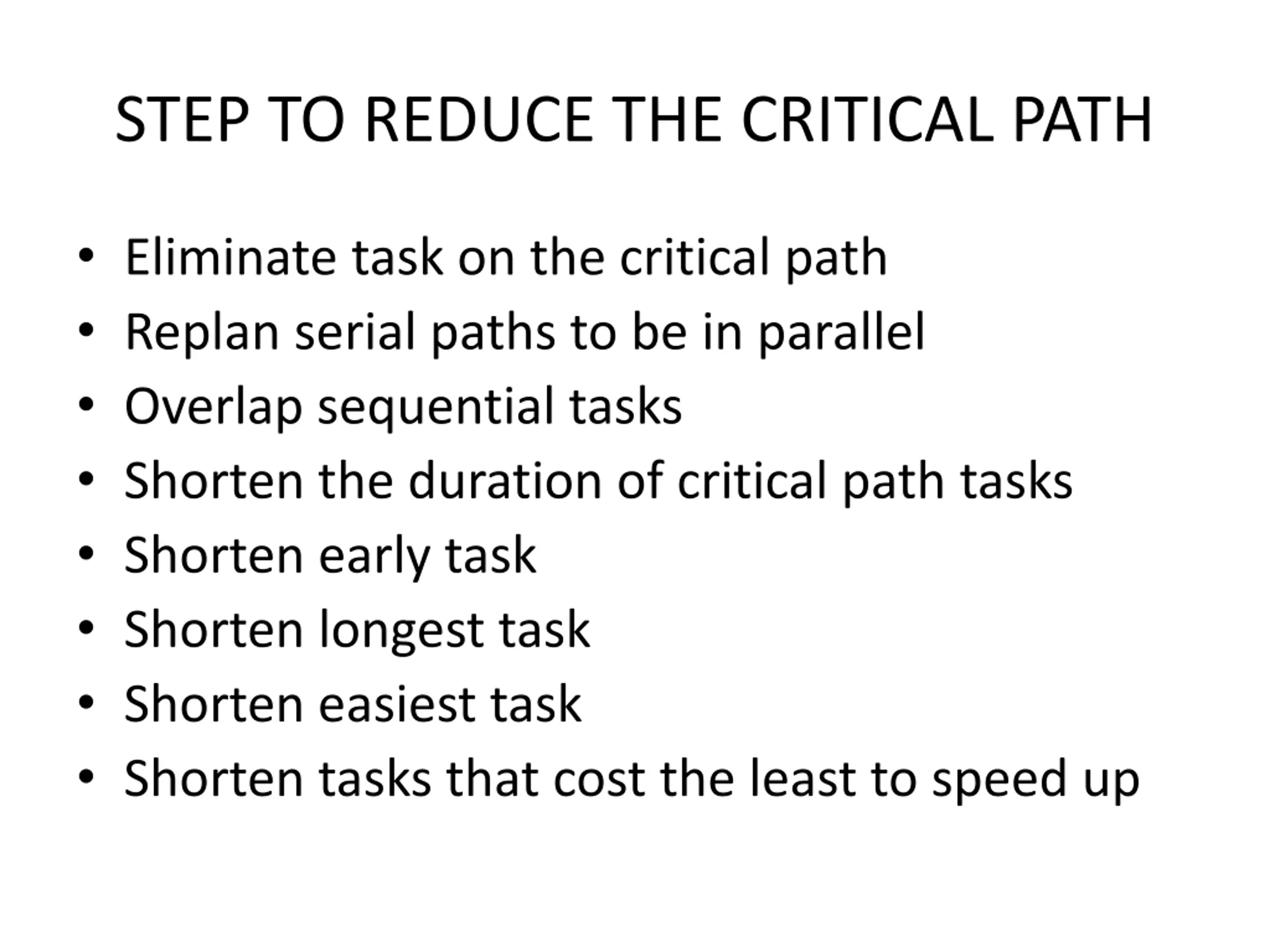 STEP TO REDUCE THE CRITICAL PATH Eliminate task on the critical path Replan serial paths to be in parallel Overlap sequential tasks Shorten the duration of critical path tasks Shorten early task Shorten longest task Shorten easiest task Shorten tasks that cost the least to speed up