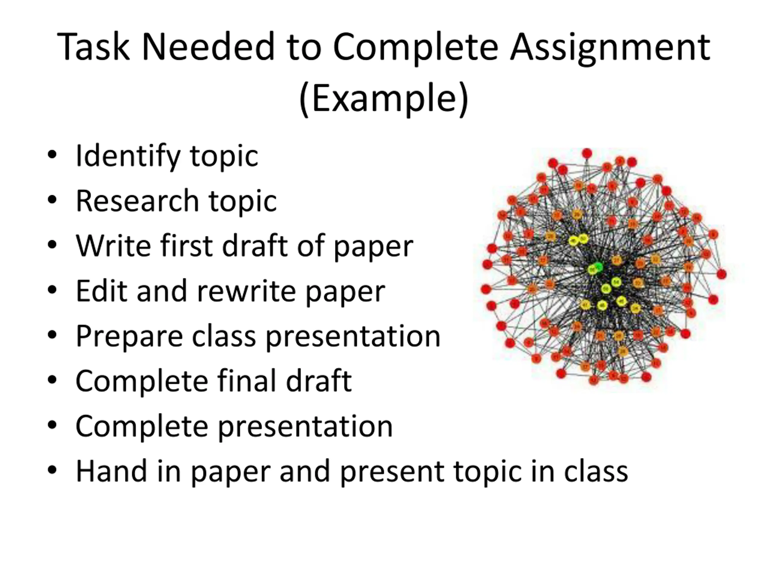 Task Needed to Complete Assignment (Example) Identify topic Research topic Write first draft of paper Edit and rewrite paper Prepare class presentation Complete final draft Complete presentation Hand in paper and present topic in class