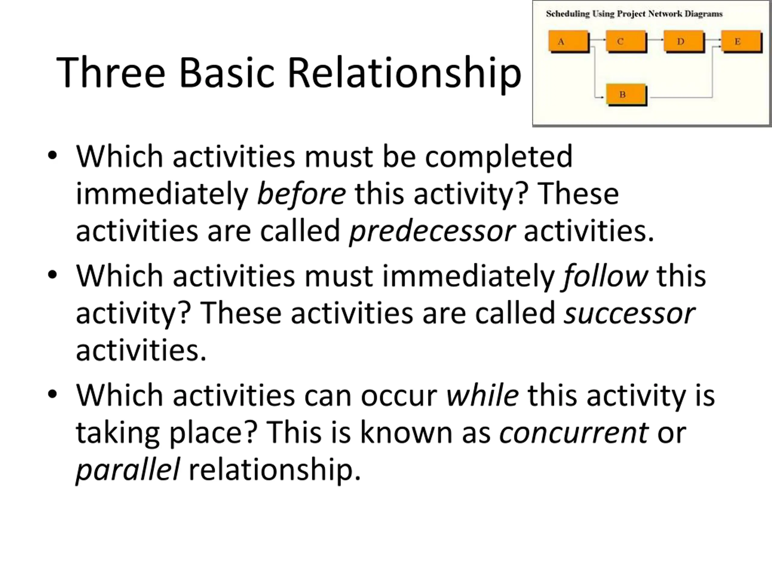 Three Basic Relationship Which activities must be completed immediately before this activity? These activities are called predecessor activities. Which activities must immediately follow this activity? These activities are called successor activities. Which activities can occur while this activity is taking place? This is known as concurrent or parallel relationship.