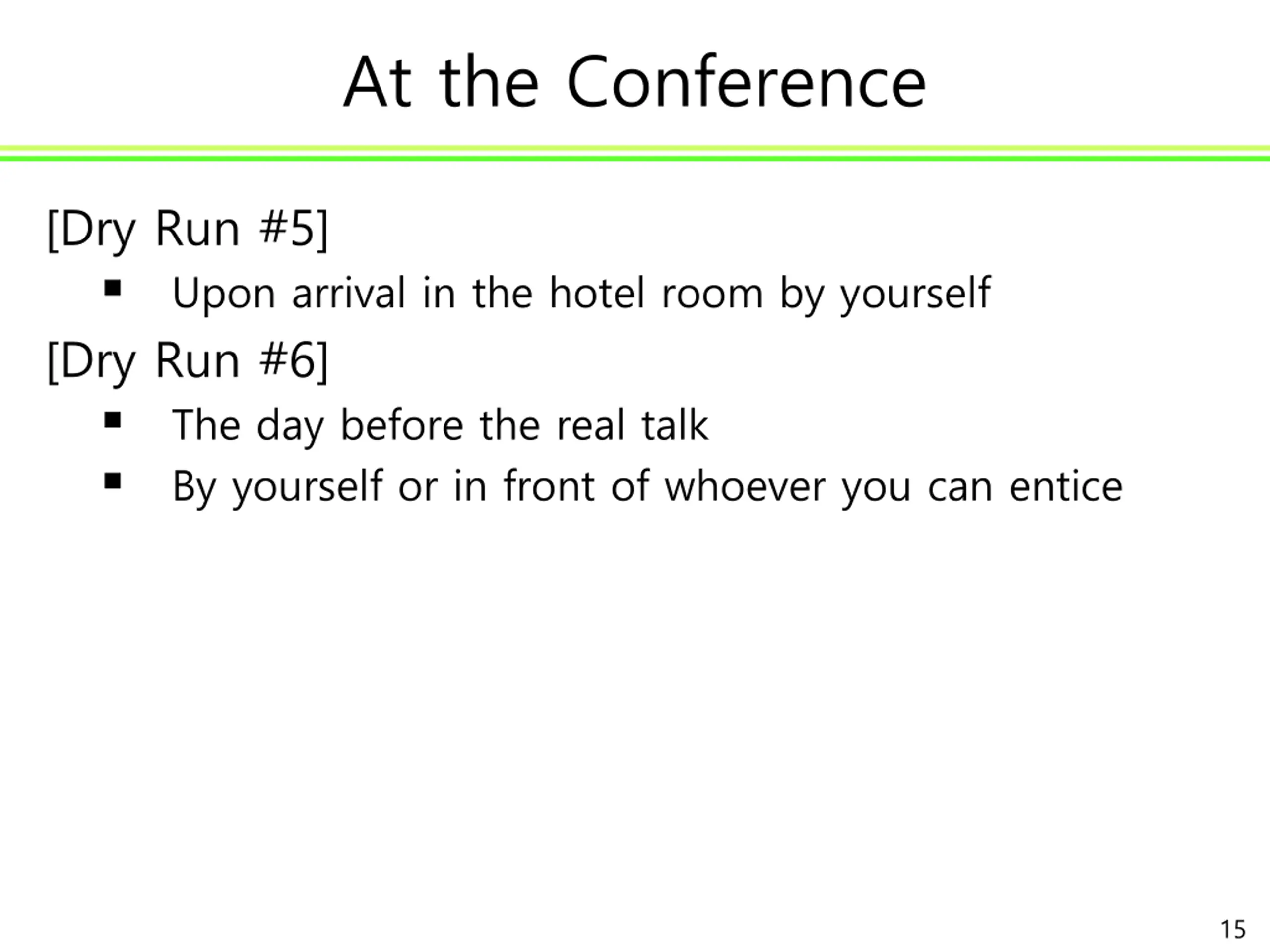At the Conference [Dry Run #5] Upon arrival in the hotel room by yourself [Dry Run #6] The day before the real talk By yourself or in front of whoever you can entice 15