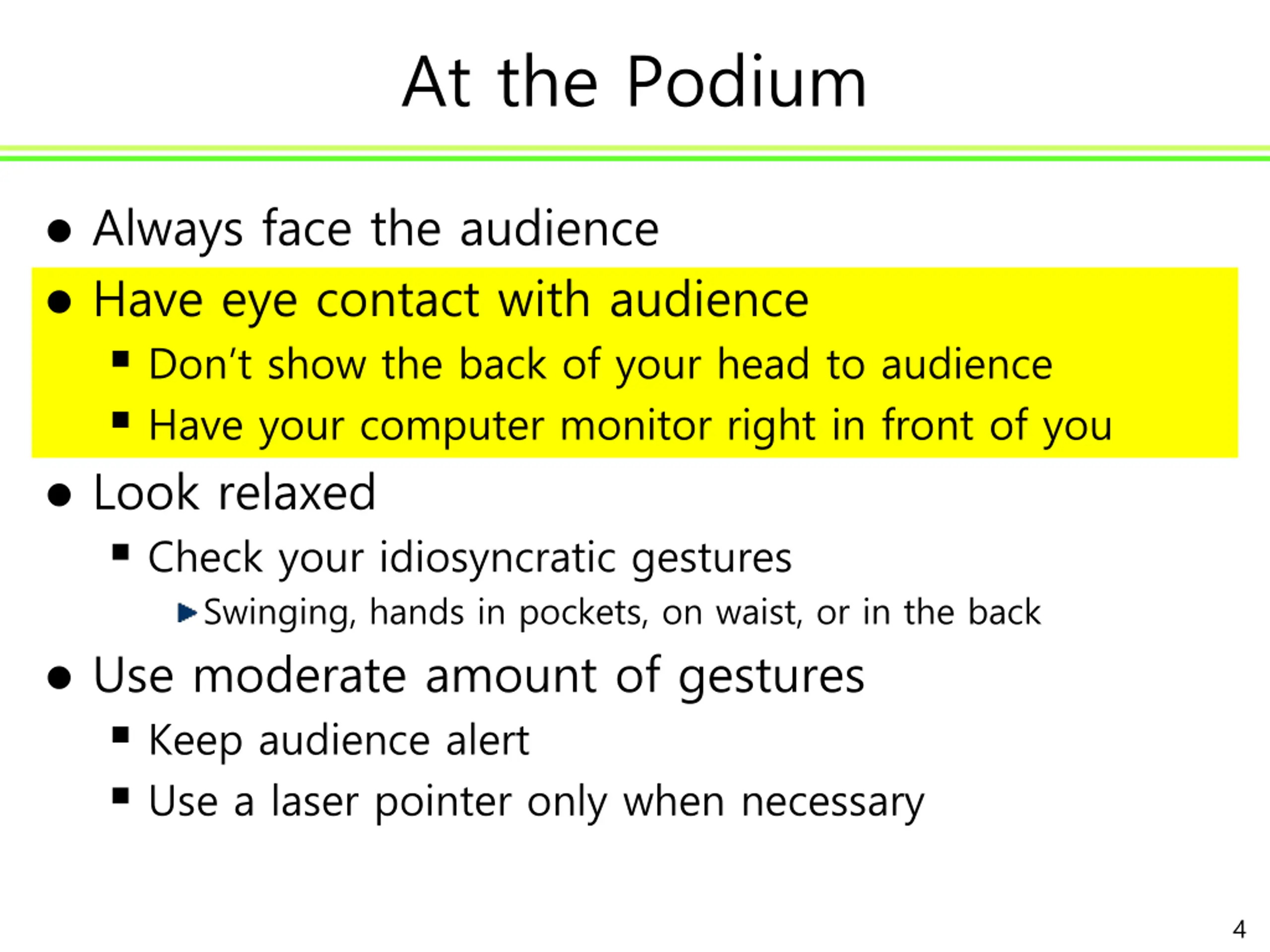 At the Podium Always face the audience Have eye contact with audience Don t show the back of your head to audience Have your computer monitor right in front of you Look relaxed Check your idiosyncratic gestures Swinging, hands in pockets, on waist, or in the back Use moderate amount of gestures Keep audience alert Use a laser pointer only when necessary 4