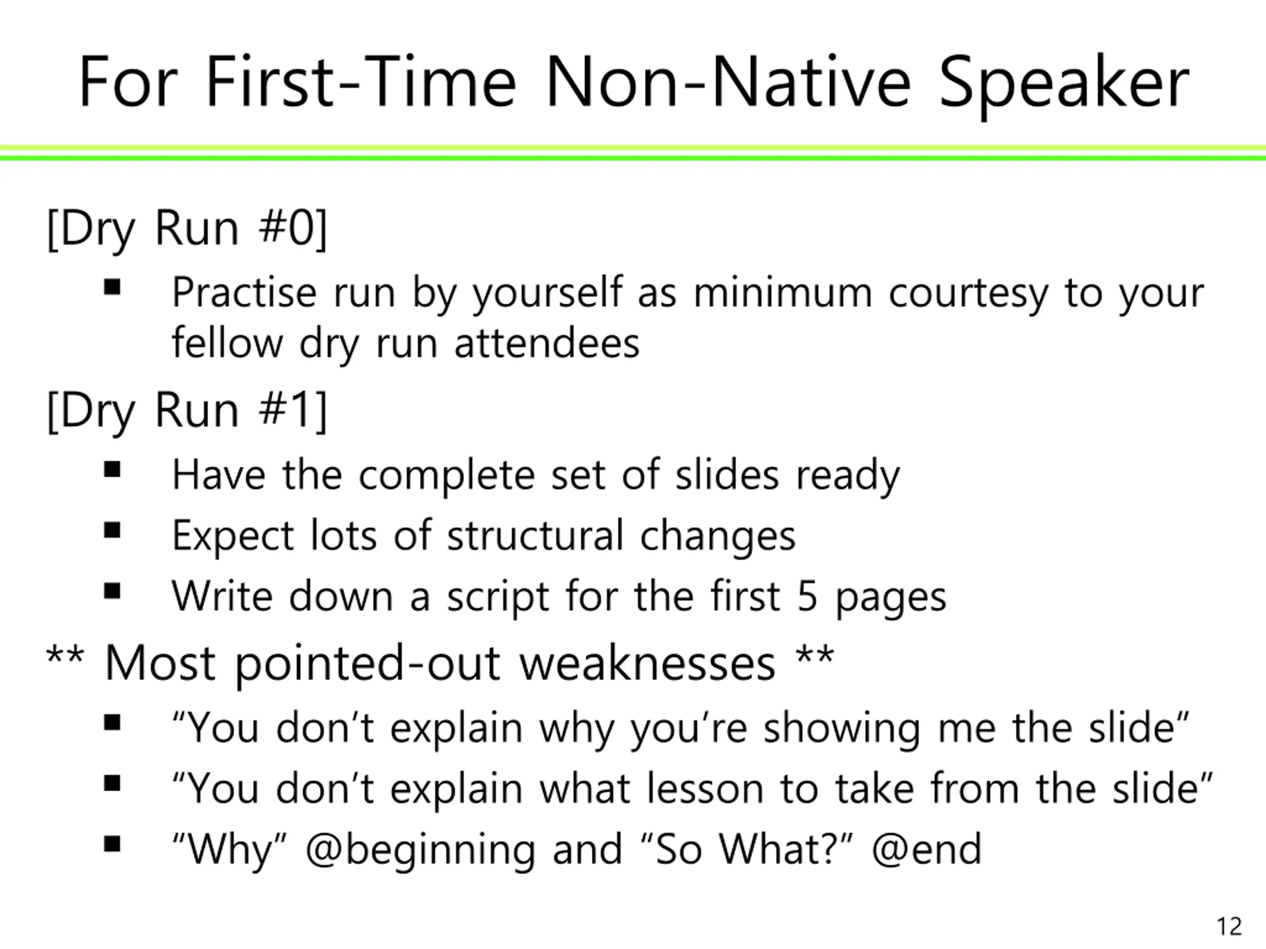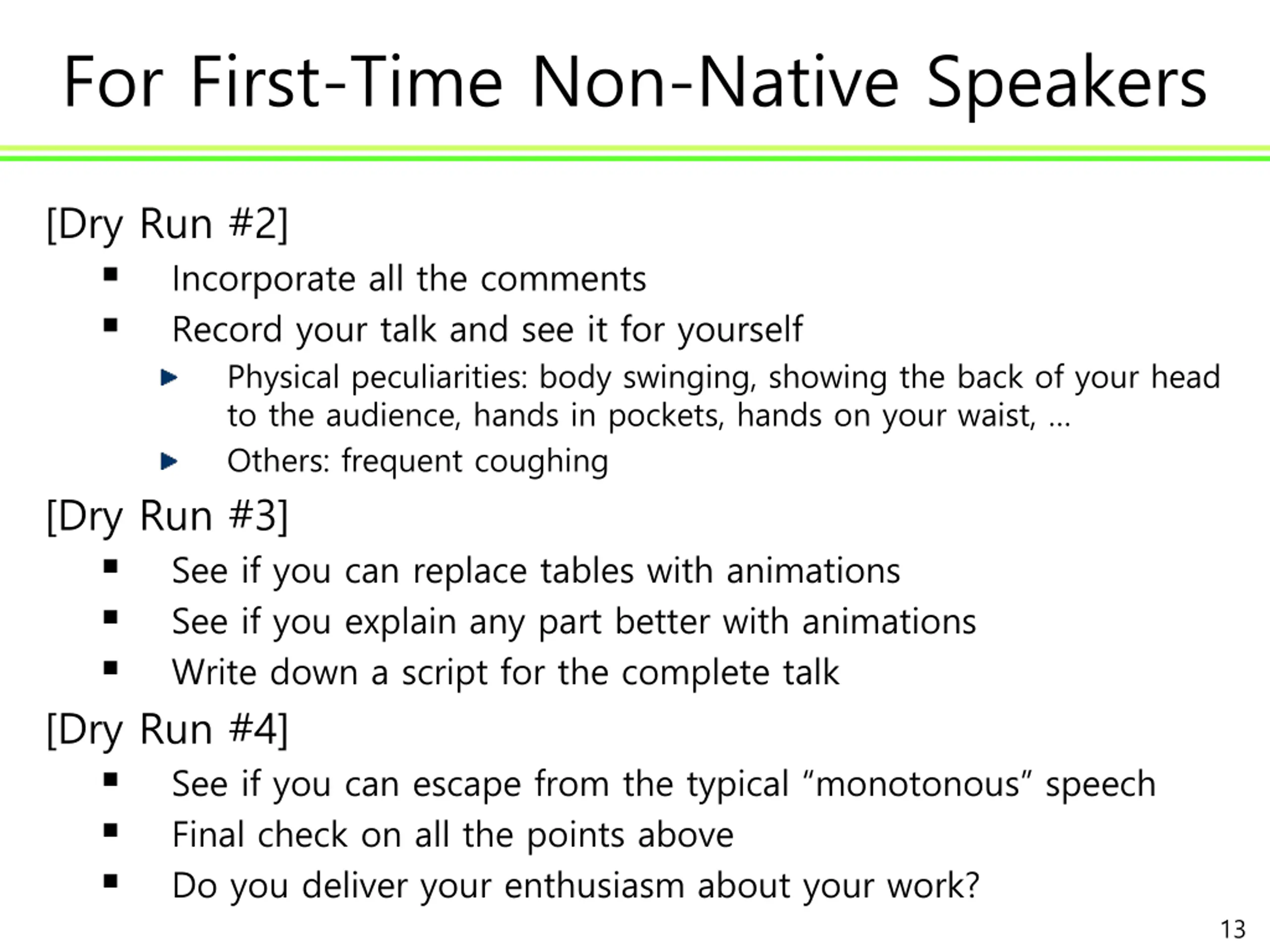 For First-Time Non-Native Speaker [Dry Run #0] Practise run by yourself as minimum courtesy to your fellow dry run attendees [Dry Run #1] Have the complete set of slides ready Expect lots of structural changes Write down a script for the first 5 pages ** Most pointed-out weaknesses ** You don t explain why you re showing me the slide You don t explain what lesson to take from the slide Why @beginning and So What? @end 12