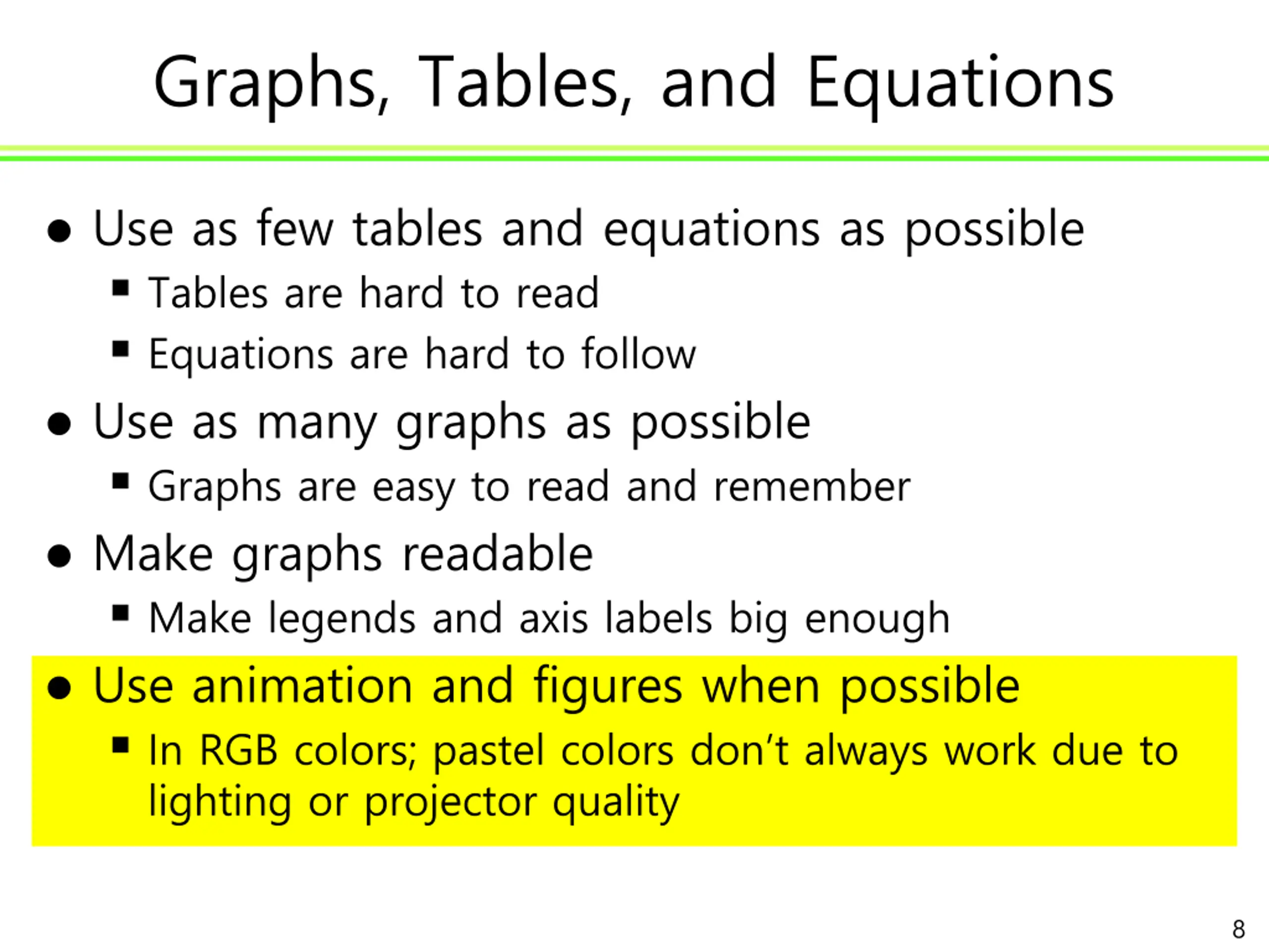 Graphs, Tables, and Equations Use as few tables and equations as possible Tables are hard to read Equations are hard to follow Use as many graphs as possible Graphs are easy to read and remember Make graphs readable Make legends and axis labels big enough Use animation and figures when possible In RGB colors; pastel colors don t always work due to lighting or projector quality 8