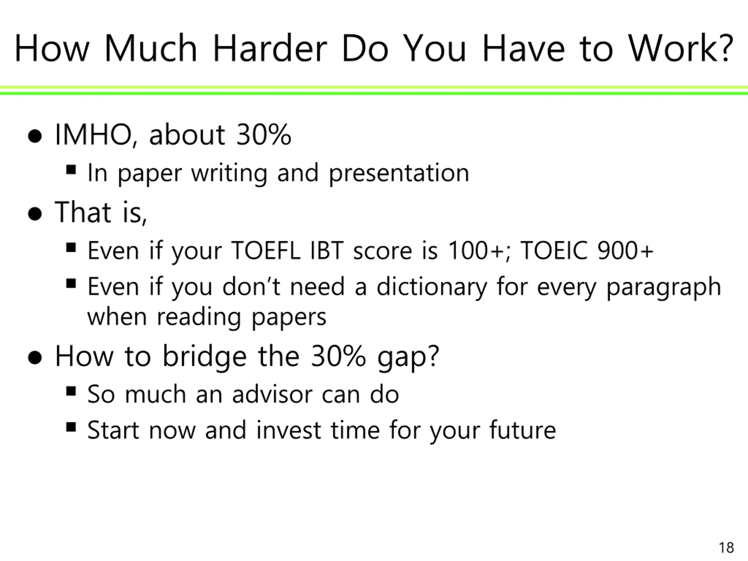 How Much Harder Do You Have to Work? IMHO, about 30% In paper writing and presentation That is, Even if your TOEFL IBT score is 100+; TOEIC 900+ Even if you don t need a dictionary for every paragraph when reading papers How to bridge the 30% gap? So much an advisor can do Start now and invest time for your future 18