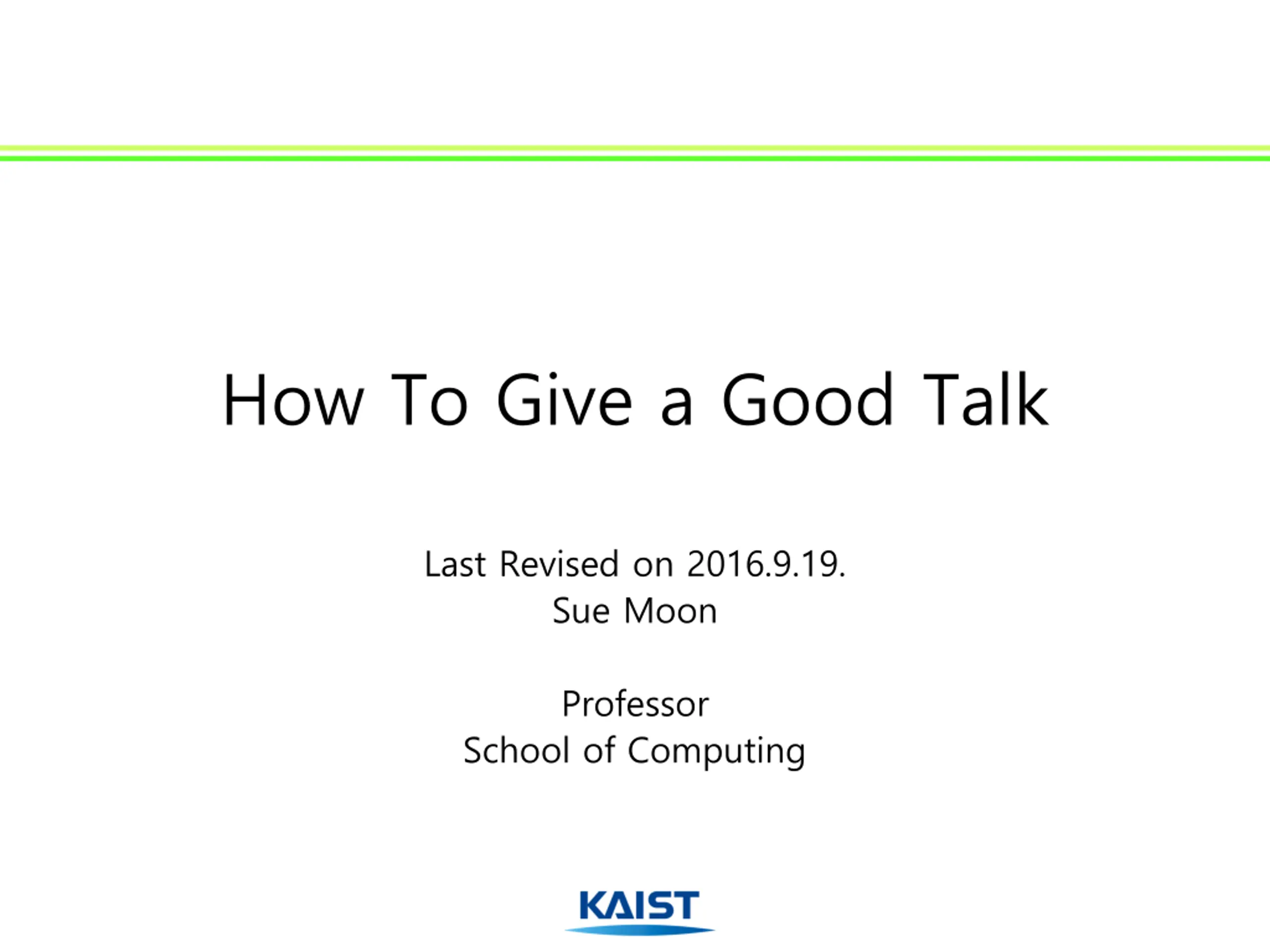 How To Give a Good Talk Last Revised on 2016.9.19. Sue Moon Professor School of Computing