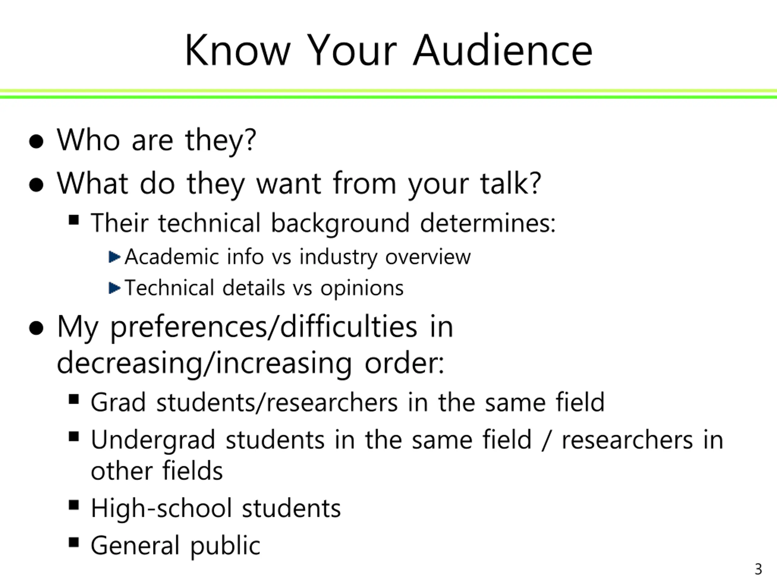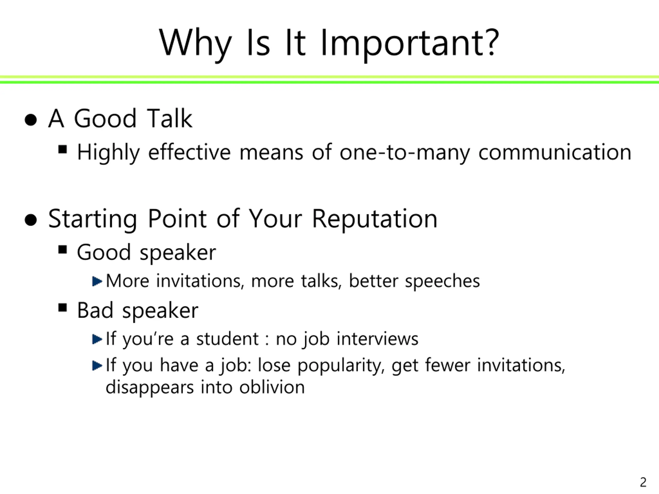 Why Is It Important? A Good Talk Highly effective means of one-to-many communication Starting Point of Your Reputation Good speaker More invitations, more talks, better speeches Bad speaker If you re a student : no job interviews If you have a job: lose popularity, get fewer invitations, disappears into oblivion 2
