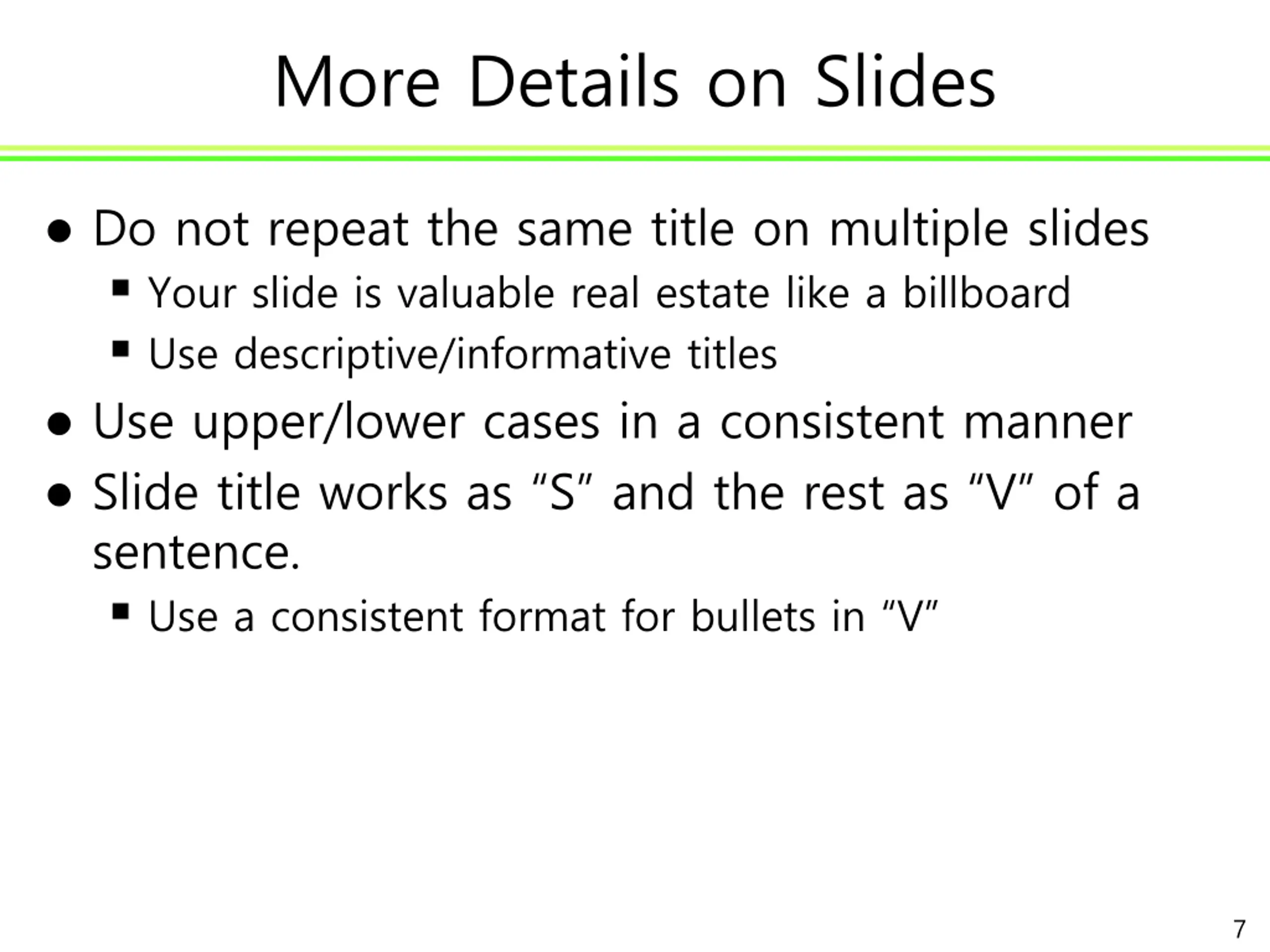 More Details on Slides Do not repeat the same title on multiple slides Your slide is valuable real estate like a billboard Use descriptive/informative titles Use upper/lower cases in a consistent manner Slide title works as S and the rest as V of a sentence. Use a consistent format for bullets in V 7