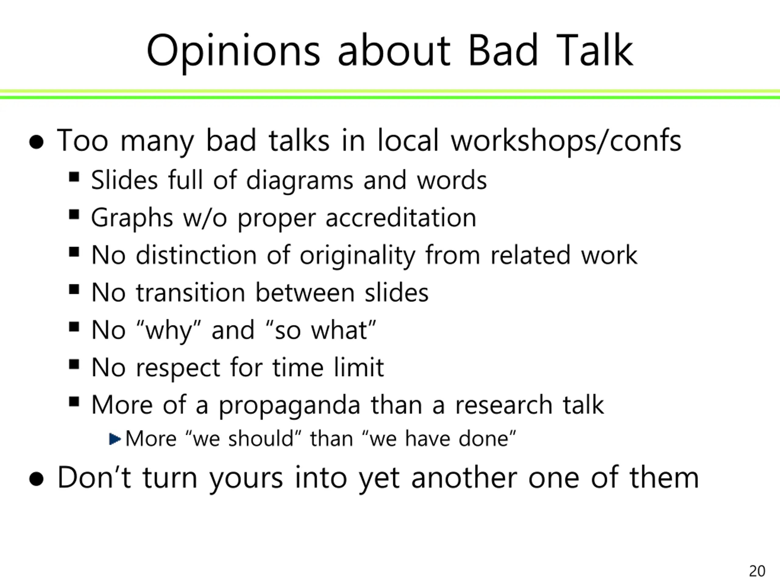 Opinions about Bad Talk Too many bad talks in local workshops/confs Slides full of diagrams and words Graphs w/o proper accreditation No distinction of originality from related work No transition between slides No why and so what No respect for time limit More of a propaganda than a research talk More we should than we have done Don t turn yours into yet another one of them 20