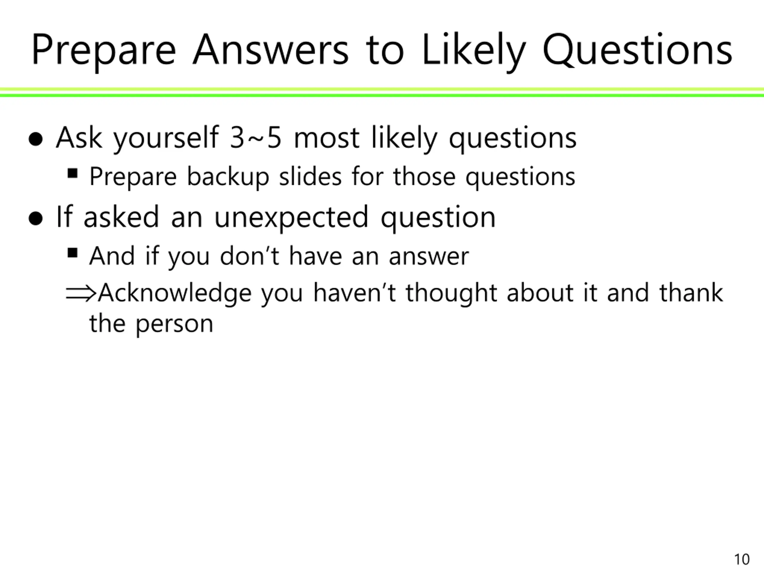 Prepare Answers to Likely Questions Ask yourself 3~5 most likely questions Prepare backup slides for those questions If asked an unexpected question And if you don t have an answer Acknowledge you haven t thought about it and thank the person 10