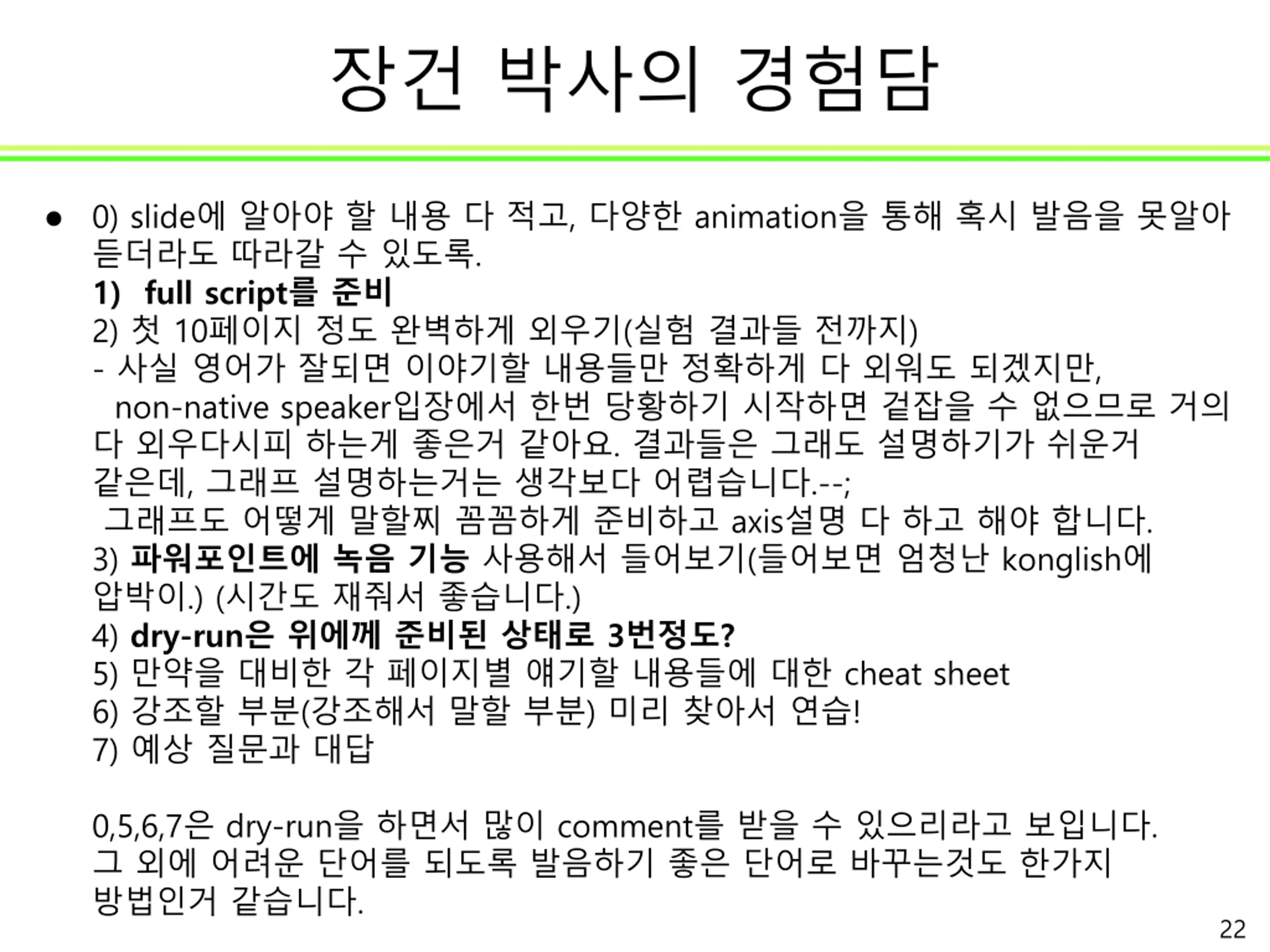 0) slide , animation . 1) full script 2) 10 ( ) - , non-native speaker . , .--; axis . 3) ( konglish .) ( .) 4) dry-run 3 ? 5) cheat sheet 6) ( ) ! 7) 0,5,6,7 dry-run comment . . 22