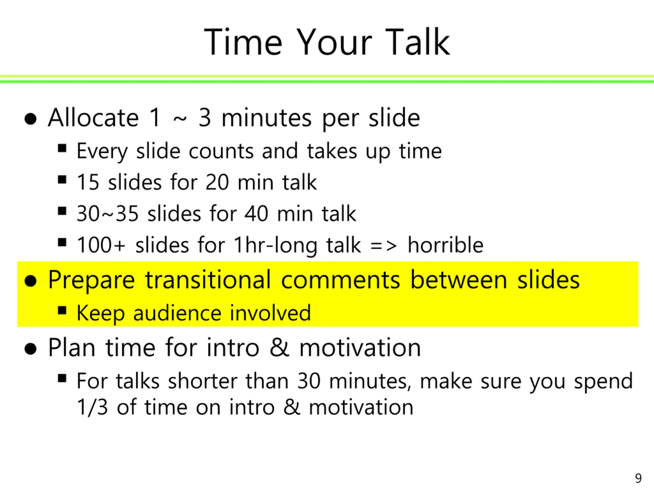 Time Your Talk Allocate 1 ~ 3 minutes per slide Every slide counts and takes up time 15 slides for 20 min talk 30~35 slides for 40 min talk 100+ slides for 1hr-long talk => horrible Prepare transitional comments between slides Keep audience involved Plan time for intro & motivation For talks shorter than 30 minutes, make sure you spend 1/3 of time on intro & motivation 9