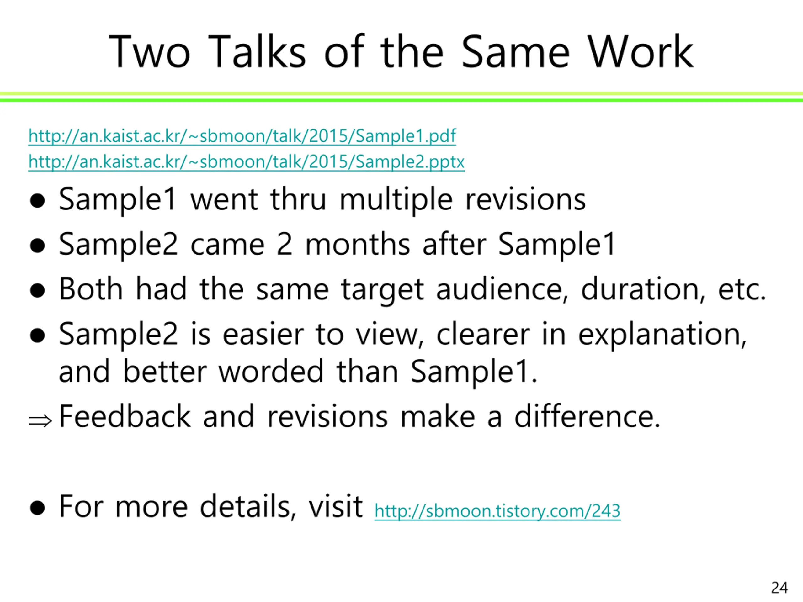 Two Talks of the Same Work http://an.kaist.ac.kr/~sbmoon/talk/2015/Sample1.pdf http://an.kaist.ac.kr/~sbmoon/talk/2015/Sample2.pptx Sample1 went thru multiple revisions Sample2 came 2 months after Sample1 Both had the same target audience, duration, etc. Sample2 is easier to view, clearer in explanation, and better worded than Sample1. Feedback and revisions make a difference. For more details, visit http://sbmoon.tistory.com/243 24