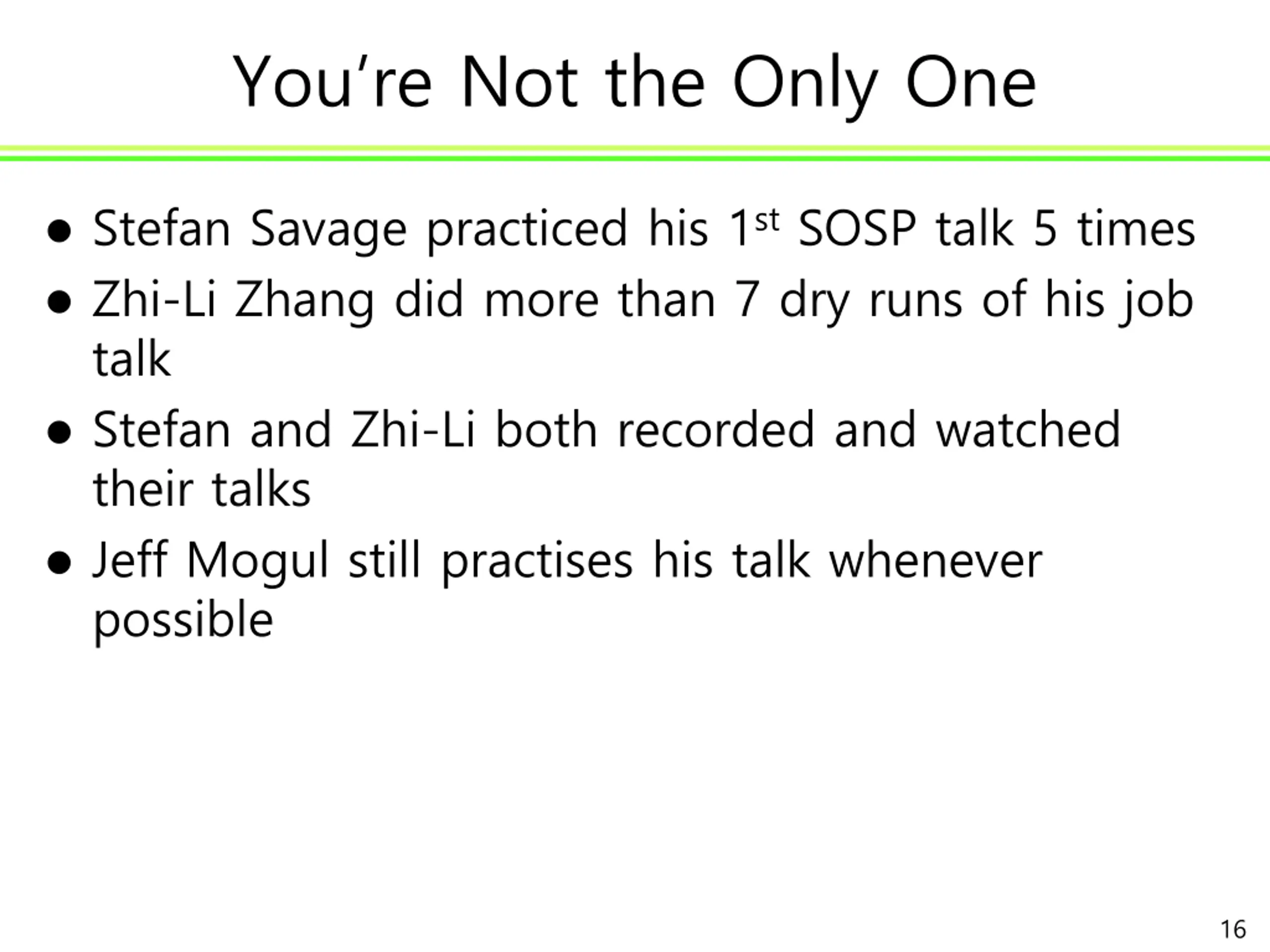 Youre Not the Only One Stefan Savage practiced his 1stSOSP talk 5 times Zhi-Li Zhang did more than 7 dry runs of his job talk Stefan and Zhi-Li both recorded and watched their talks Jeff Mogul still practises his talk whenever possible 16