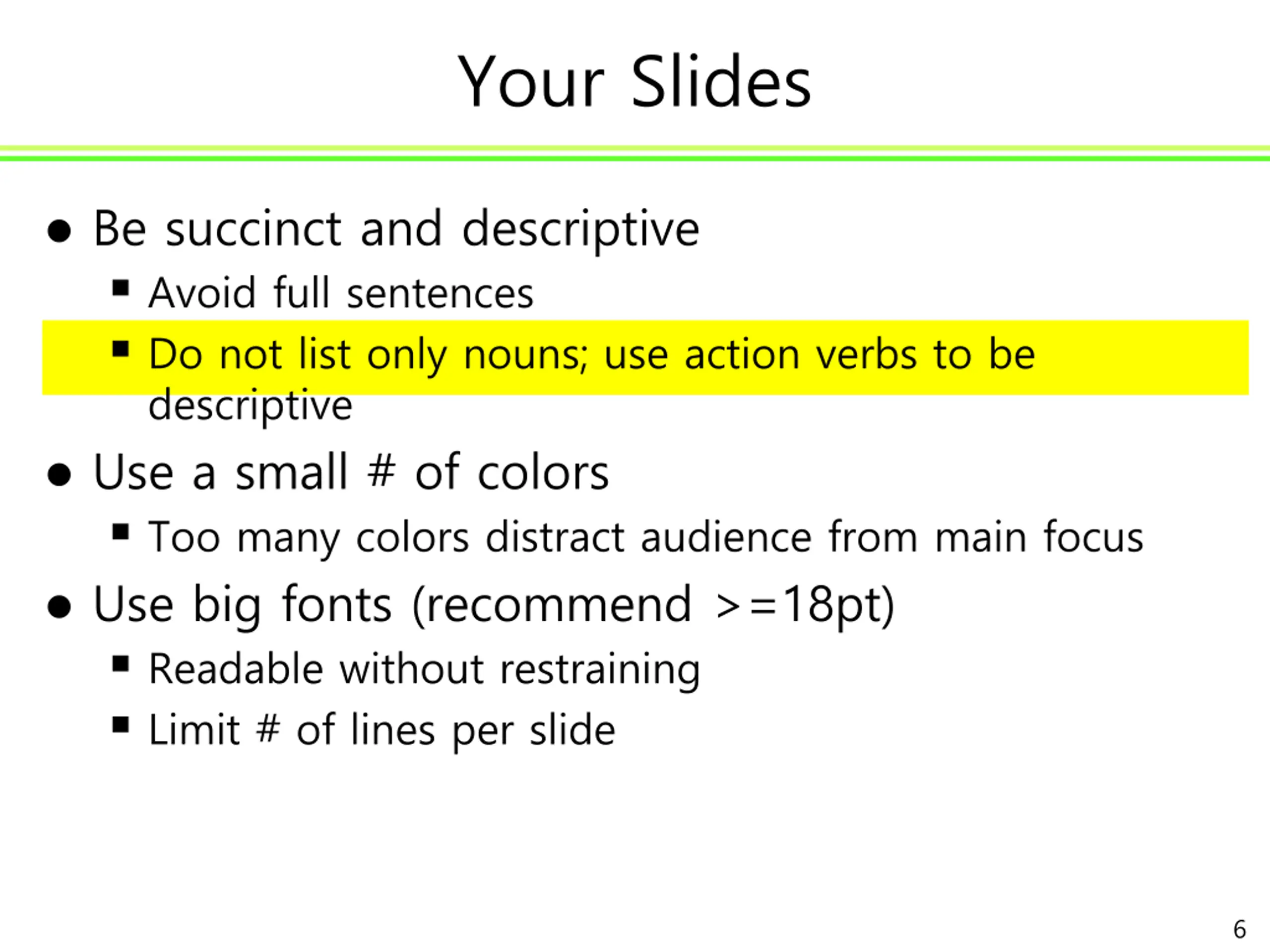 Your Slides Be succinct and descriptive Avoid full sentences Do not list only nouns; use action verbs to be descriptive Use a small # of colors Too many colors distract audience from main focus Use big fonts (recommend >=18pt) Readable without restraining Limit # of lines per slide 6