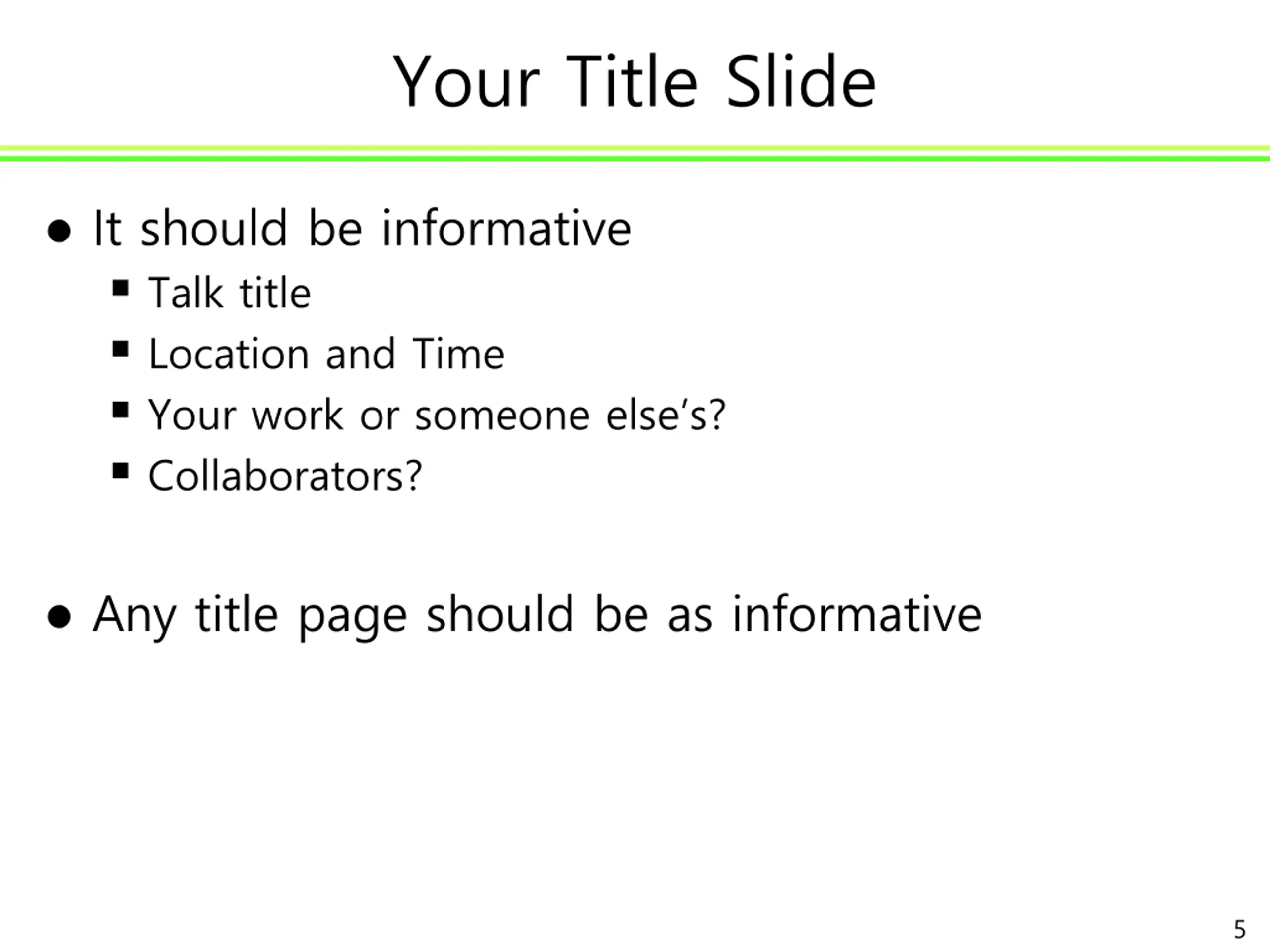 Your Title Slide It should be informative Talk title Location and Time Your work or someone else s? Collaborators? Any title page should be as informative 5