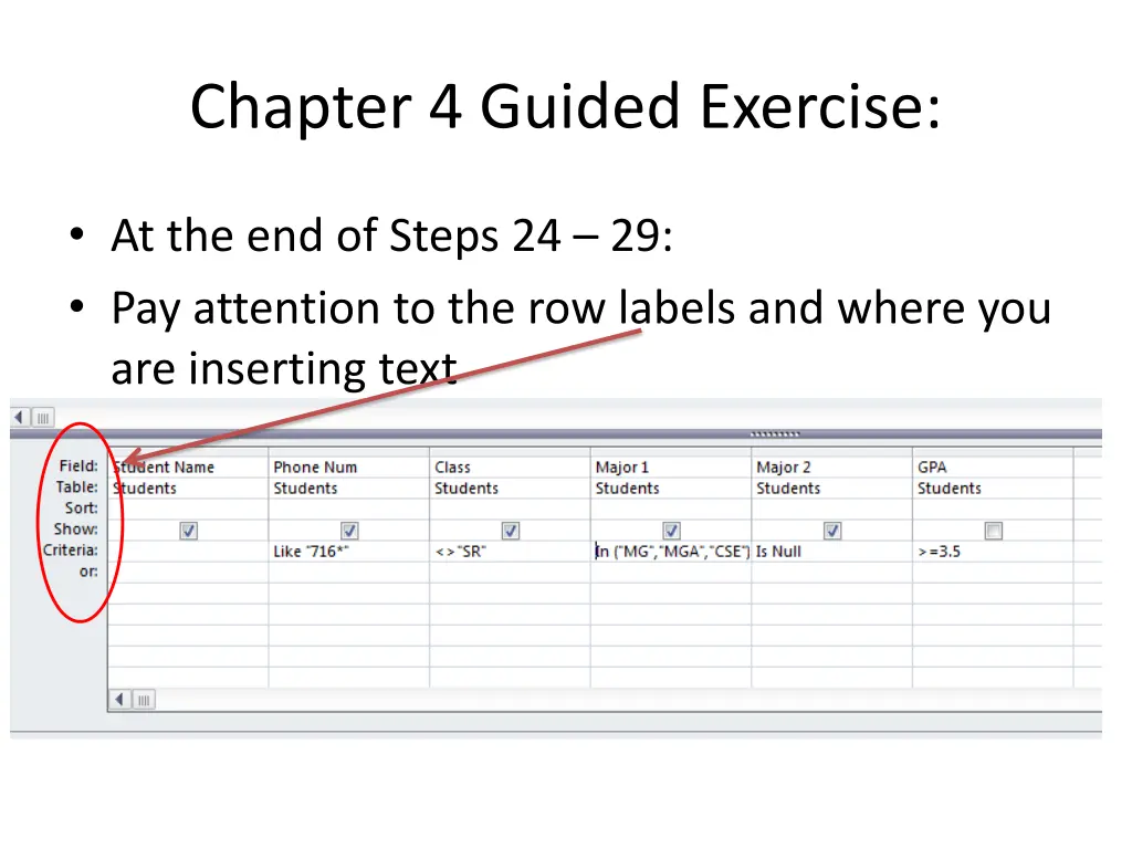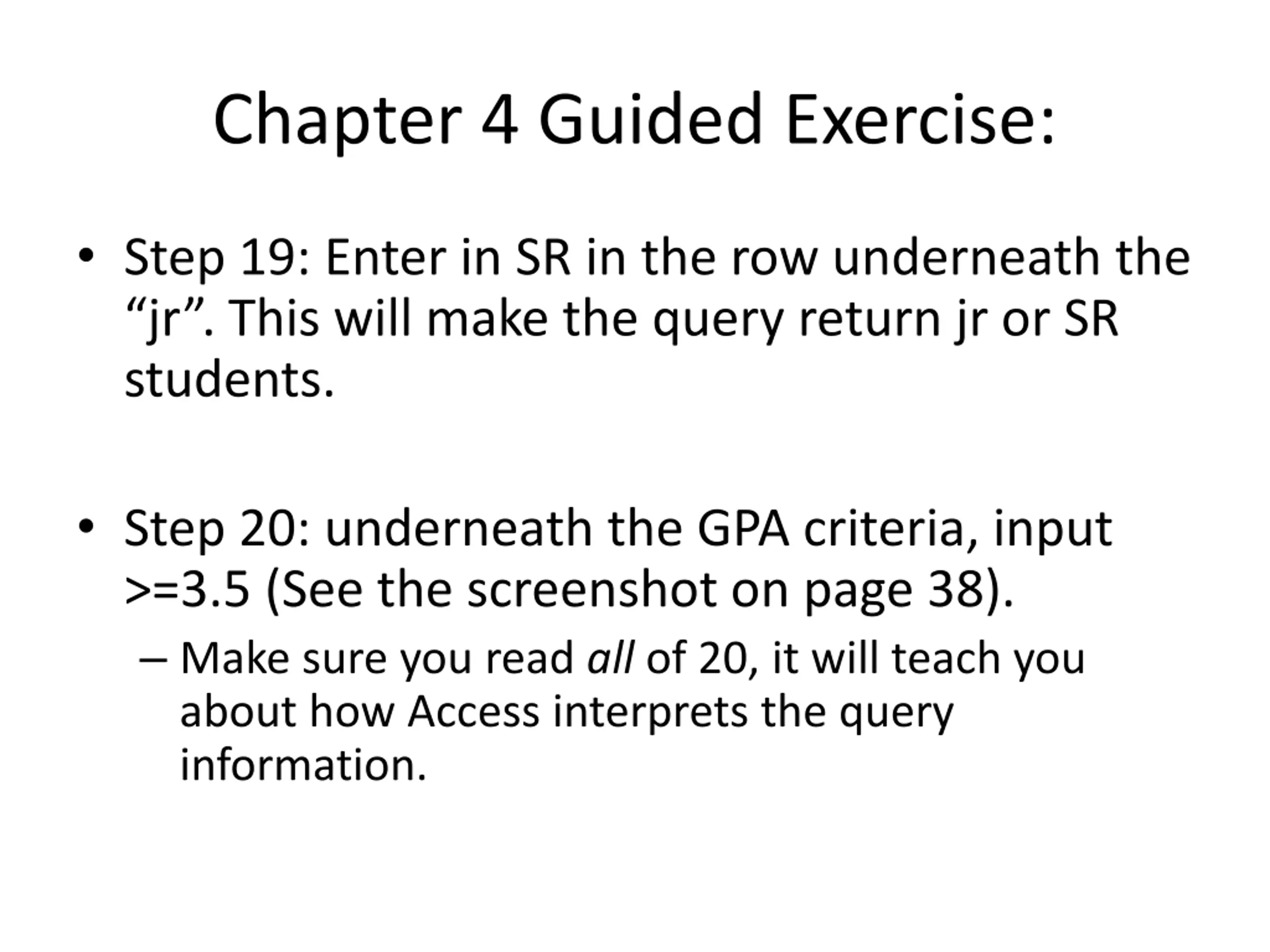 Chapter 4 Guided Exercise: Step 19: Enter in SR in the row underneath the jr . This will make the query return jr or SR students. Step 20: underneath the GPA criteria, input >=3.5 (See the screenshot on page 38). Make sure you read all of 20, it will teach you about how Access interprets the query information.