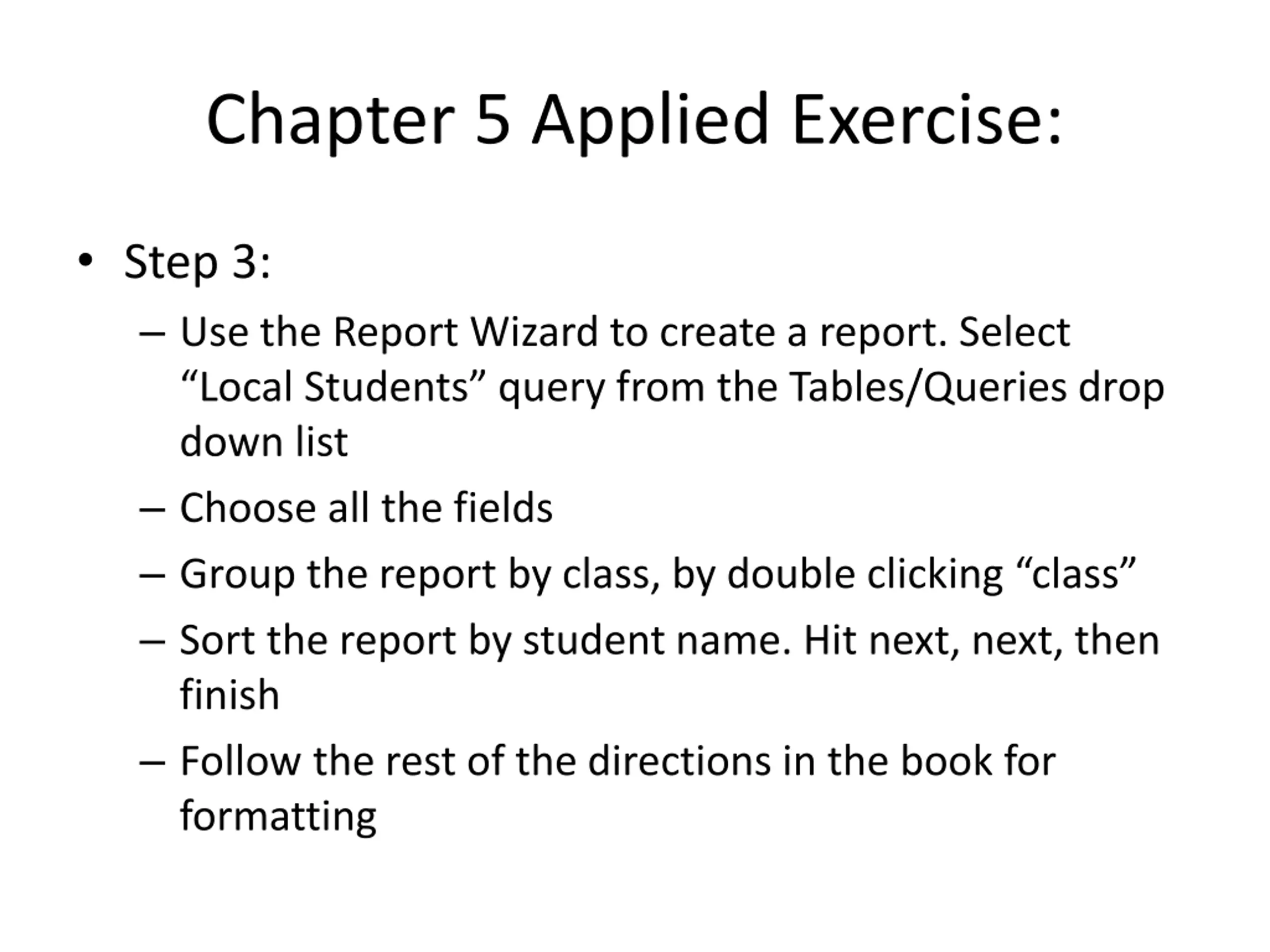 Chapter 5 Applied Exercise: Step 3: Use the Report Wizard to create a report. Select Local Students query from the Tables/Queries drop down list Choose all the fields Group the report by class, by double clicking class Sort the report by student name. Hit next, next, then finish Follow the rest of the directions in the book for formatting