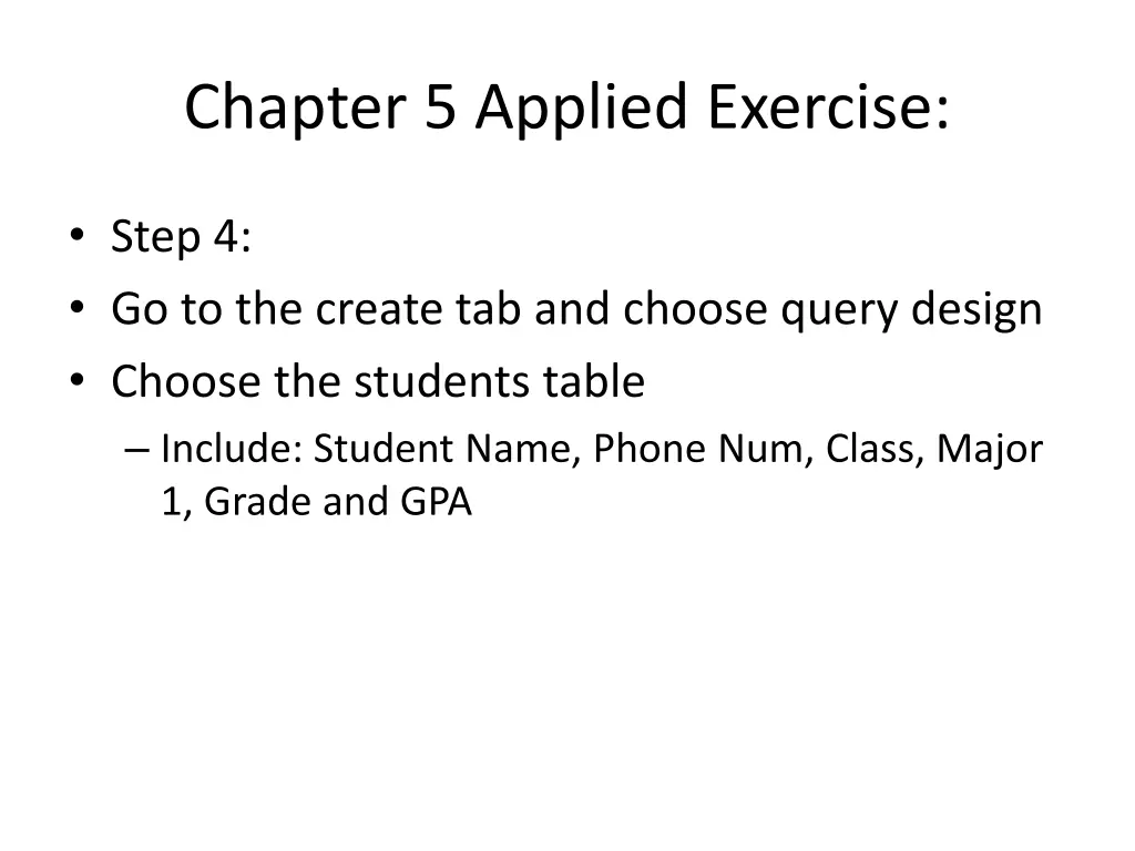 Chapter 5 Applied Exercise: Step 4: Go to the create tab and choose query design Choose the students table Include: Student Name, Phone Num, Class, Major 1, Grade and GPA