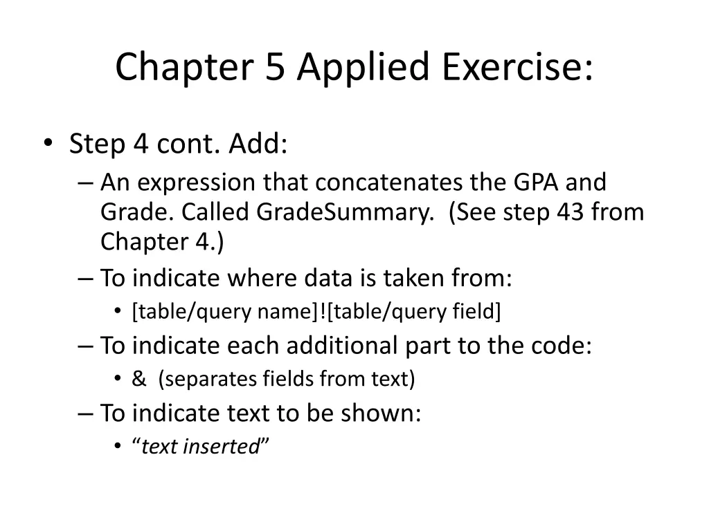 Chapter 5 Applied Exercise: Step 4 cont. Add: An expression that concatenates the GPA and Grade. Called GradeSummary. (See step 43 from Chapter 4.) To indicate where data is taken from: [table/query name]![table/query field] To indicate each additional part to the code: & (separates fields from text) To indicate text to be shown: text inserted