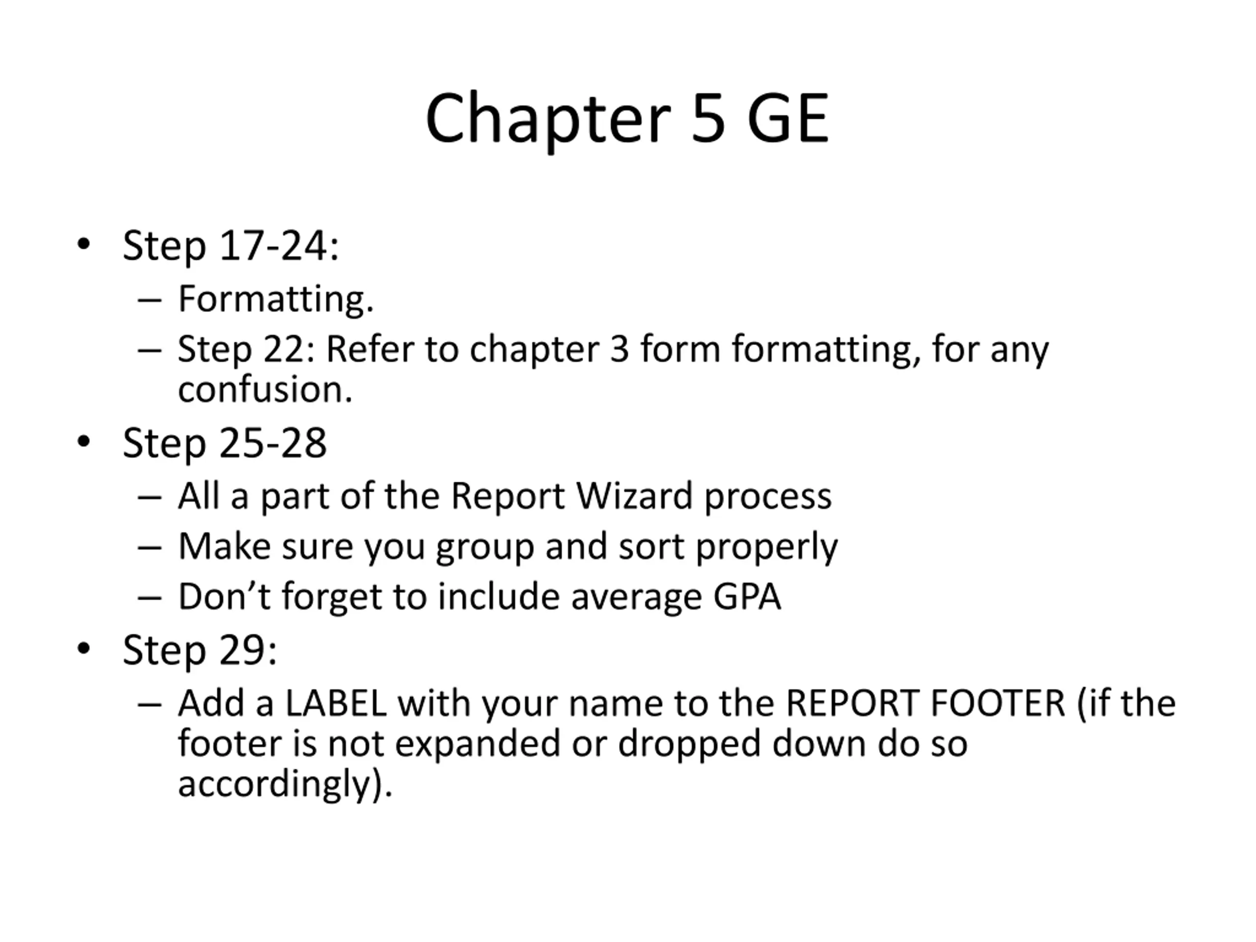 Chapter 5 GE Step 17-24: Formatting. Step 22: Refer to chapter 3 form formatting, for any confusion. Step 25-28 All a part of the Report Wizard process Make sure you group and sort properly Don t forget to include average GPA Step 29: Add a LABEL with your name to the REPORT FOOTER (if the footer is not expanded or dropped down do so accordingly).