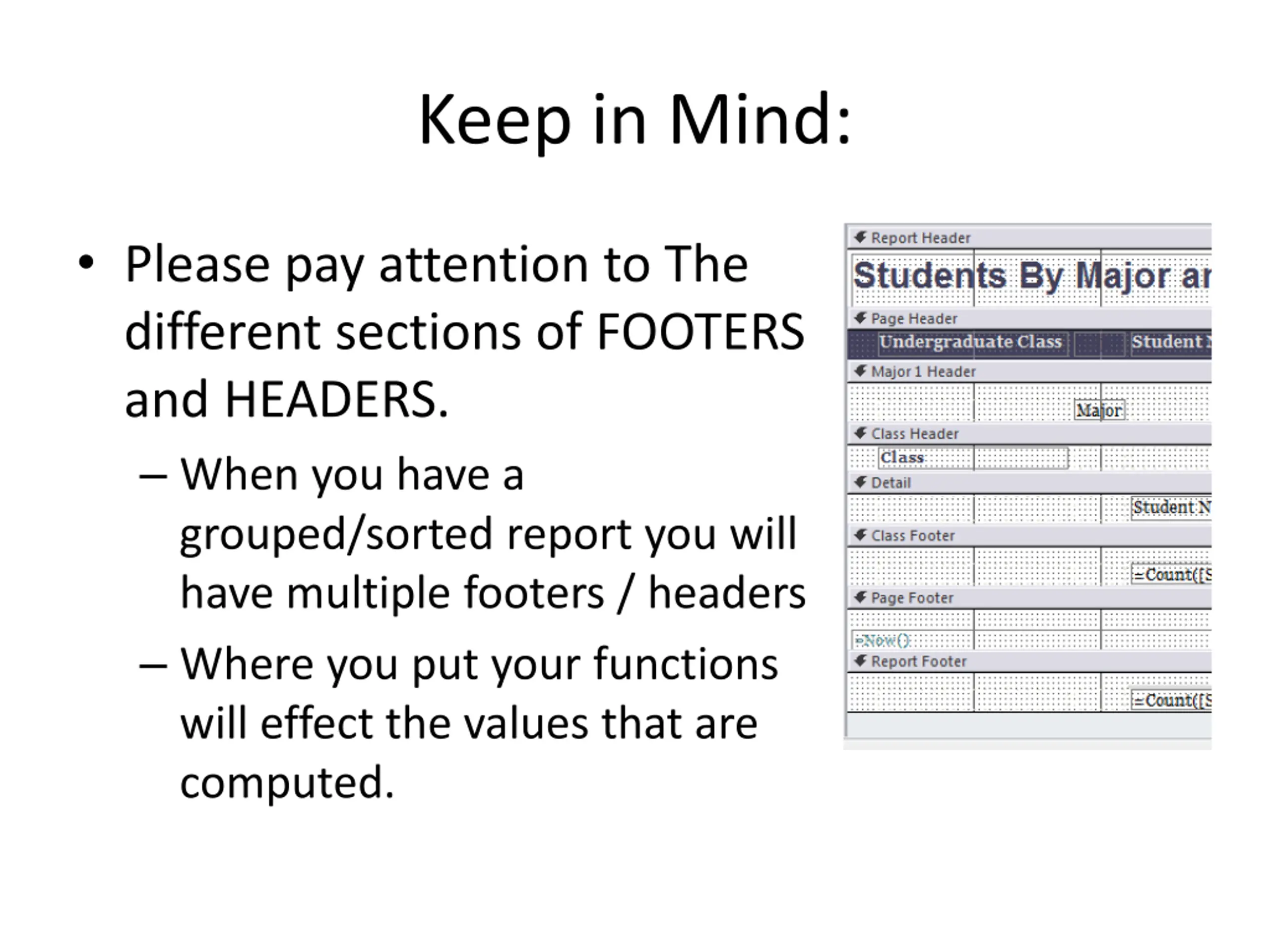 FUNCTIONS FOR HW #3: =Avg([Field]) Used to average number values in a specific field references =Count([Field]) Used to count number of field entries OR you can: Click on a specific control field (in designview) Then Click on the button and select the appropriate function you want to appear