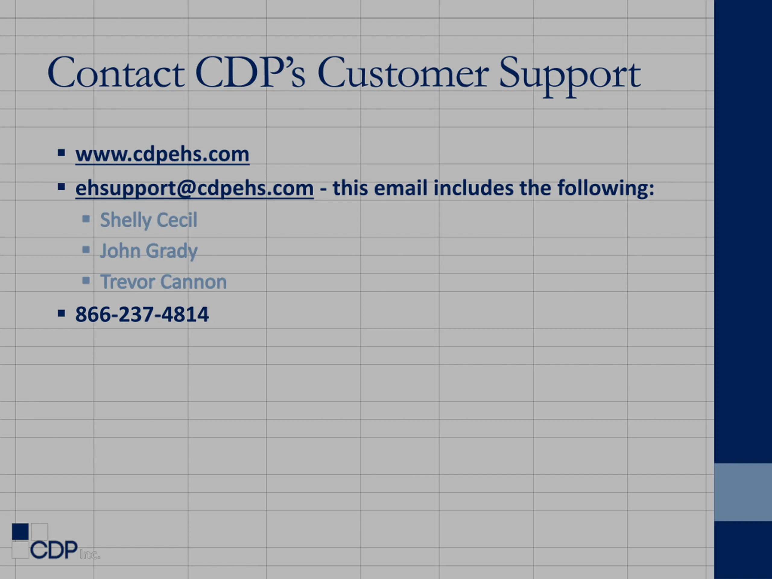Contact CDPs Customer Support www.cdpehs.com ehsupport@cdpehs.com - this email includes the following: Shelly Cecil John Grady Trevor Cannon 866-237-4814