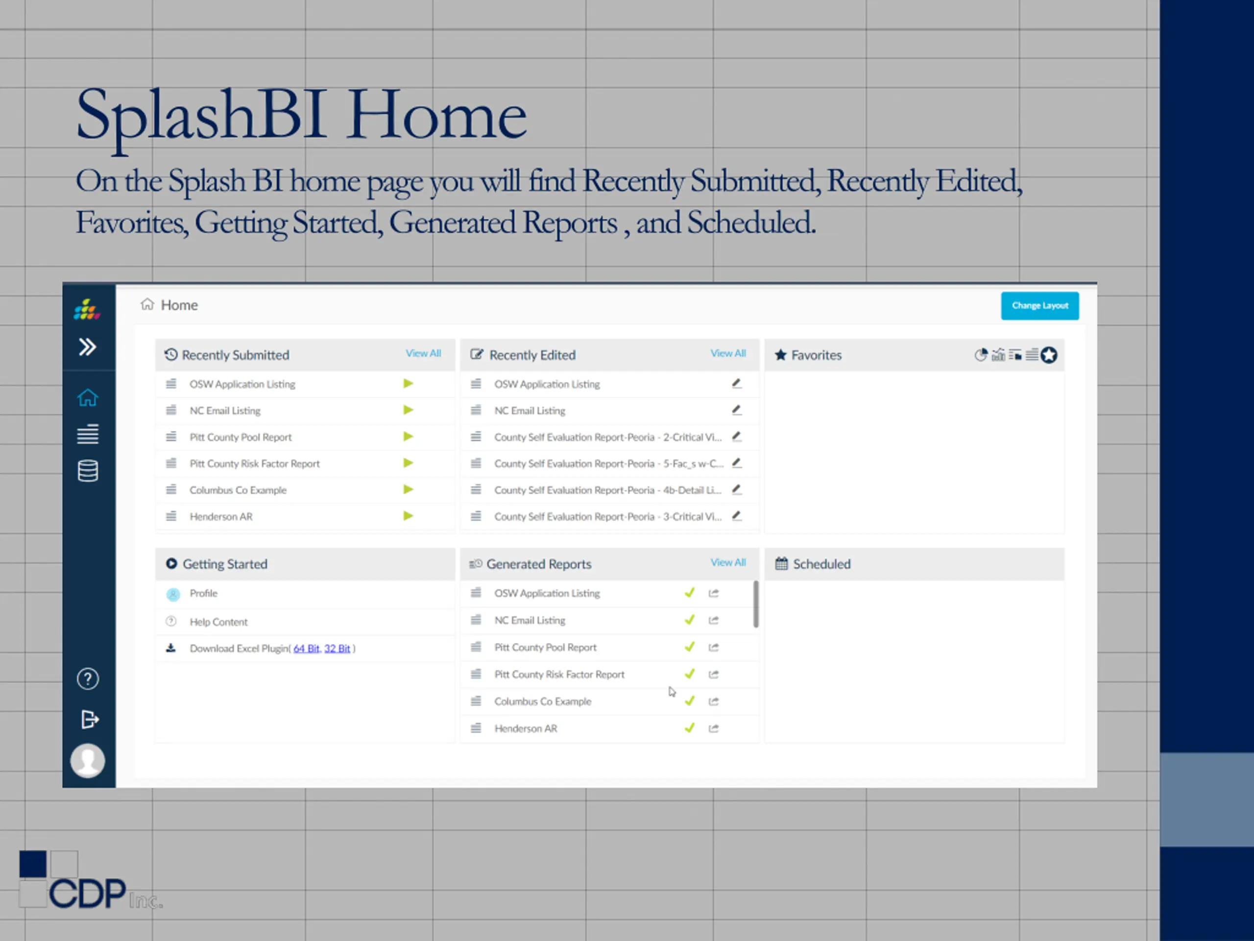 SplashBIHome On the Splash BI home page you will find Recently Submitted, Recently Edited, Favorites, Getting Started, Generated Reports , and Scheduled.