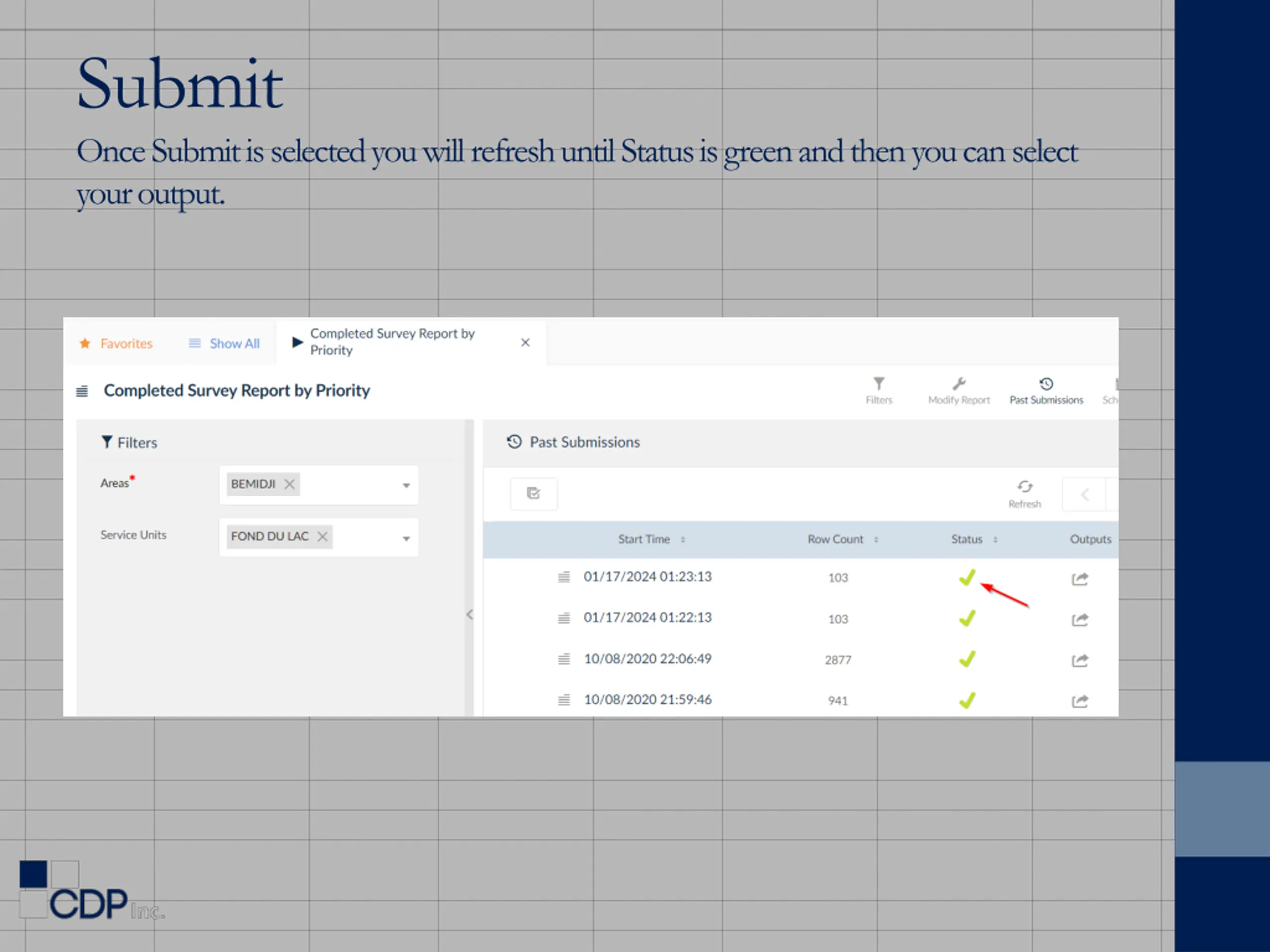 Submit Once Submit is selected you will refresh until Status is green and then you can select your output.