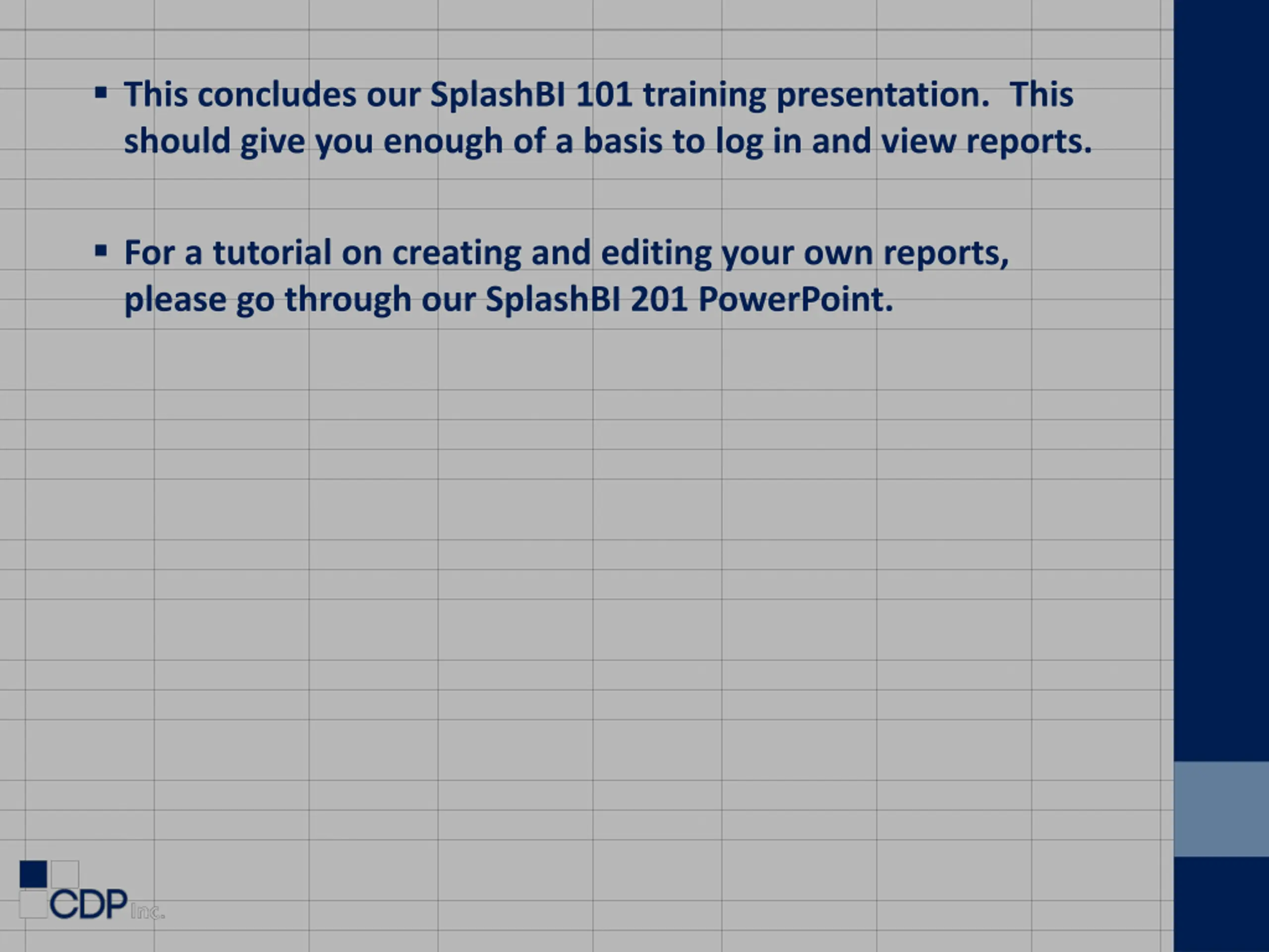 This concludes our SplashBI 101 training presentation. This should give you enough of a basis to log in and view reports. For a tutorial on creating and editing your own reports, please go through our SplashBI 201 PowerPoint.