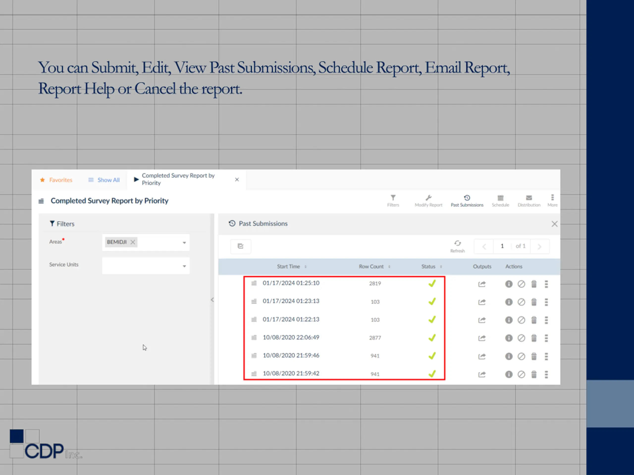 You can Submit, Edit, View Past Submissions, Schedule Report, Email Report, Report Help or Cancel the report.