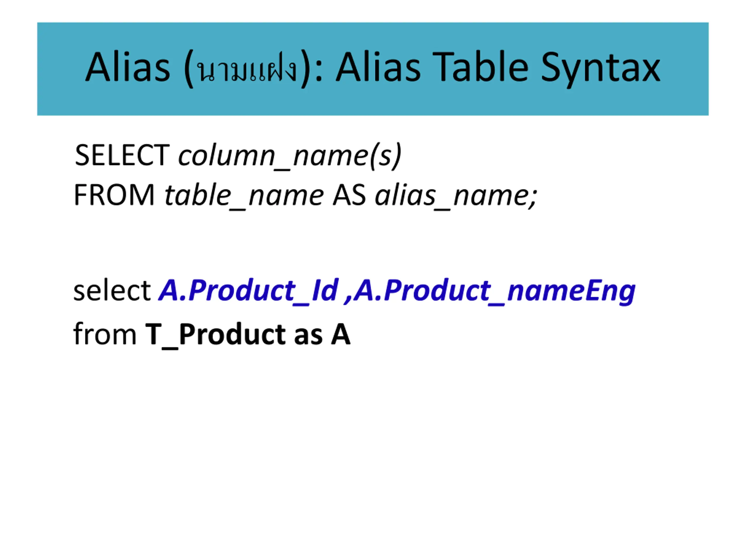 Alias (): Alias Table Syntax SELECT column_name(s) FROM table_name AS alias_name; select A.Product_Id ,A.Product_nameEng from T_Product as A
