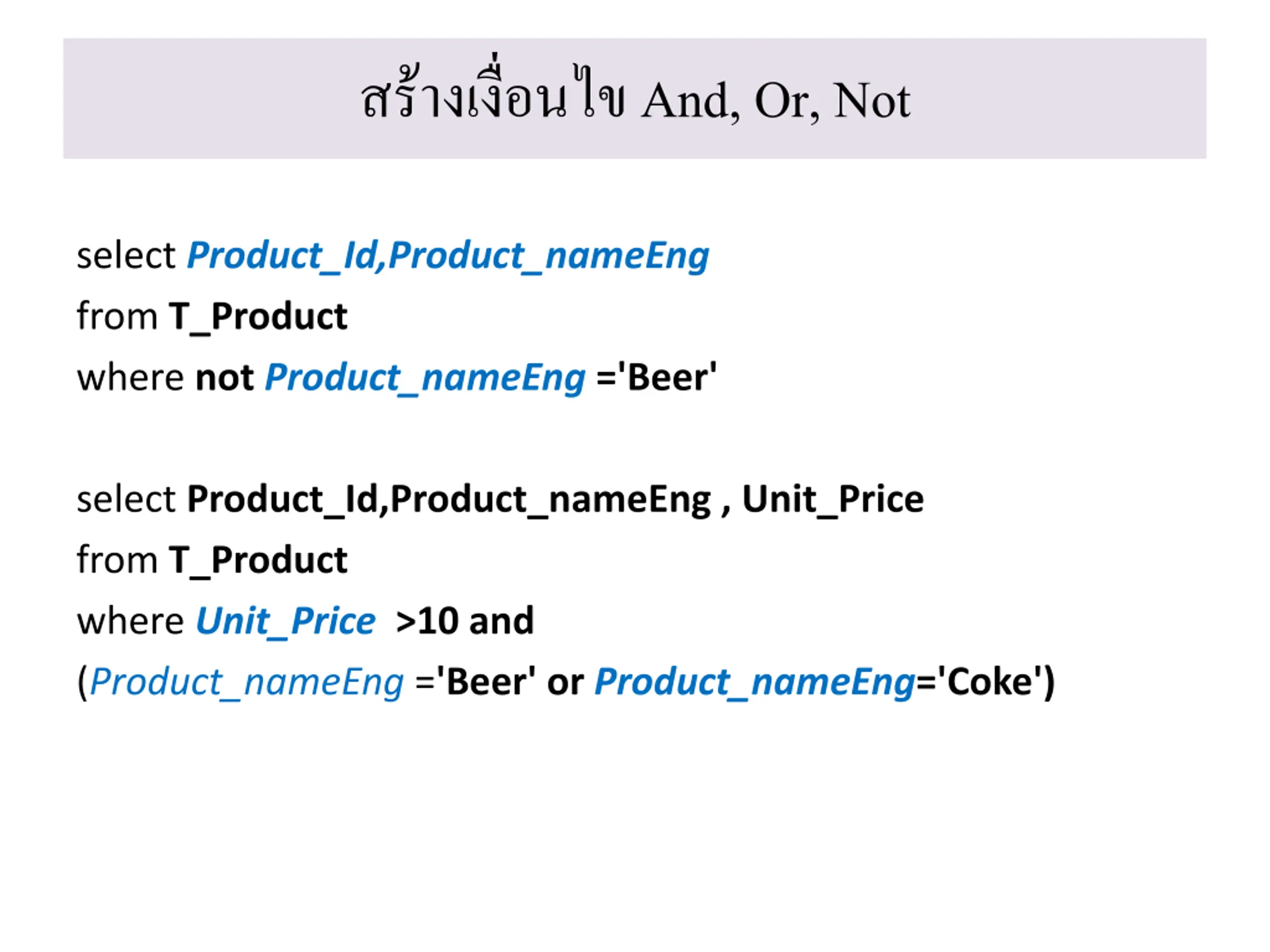 And, Or, Not select Product_Id,Product_nameEng from T_Product where not Product_nameEng ='Beer' select Product_Id,Product_nameEng , Unit_Price from T_Product where Unit_Price >10 and (Product_nameEng ='Beer' or Product_nameEng='Coke')