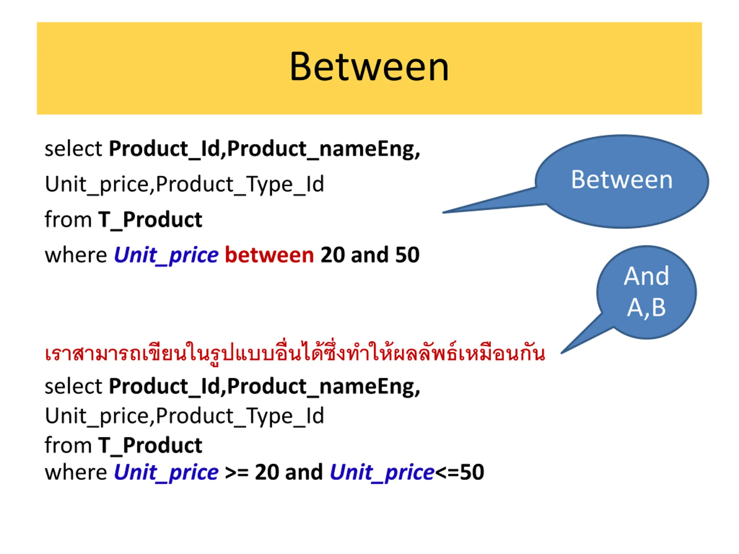Between select Product_Id,Product_nameEng, Unit_price,Product_Type_Id from T_Product where Unit_price between 20 and 50 Between And A,B select Product_Id,Product_nameEng, Unit_price,Product_Type_Id from T_Product where Unit_price >= 20 and Unit_price<=50