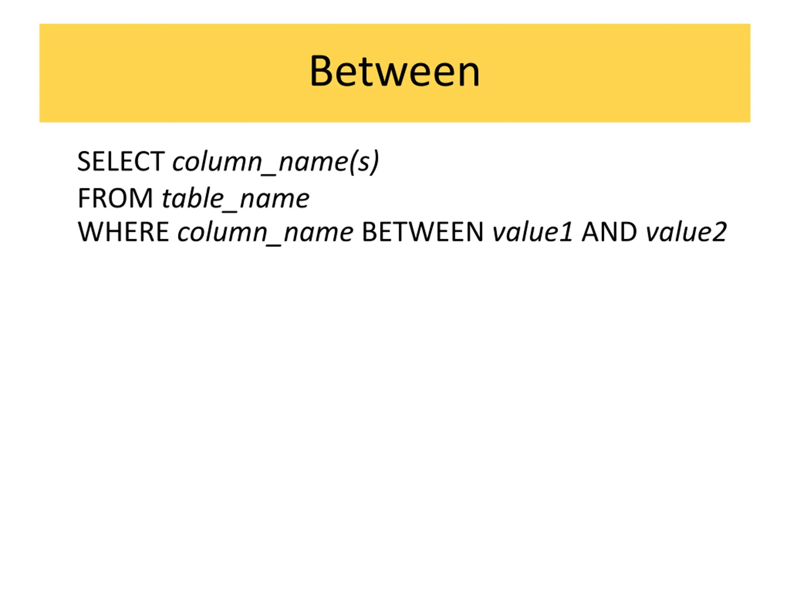 Between SELECT column_name(s) FROM table_name WHERE column_name BETWEEN value1 AND value2