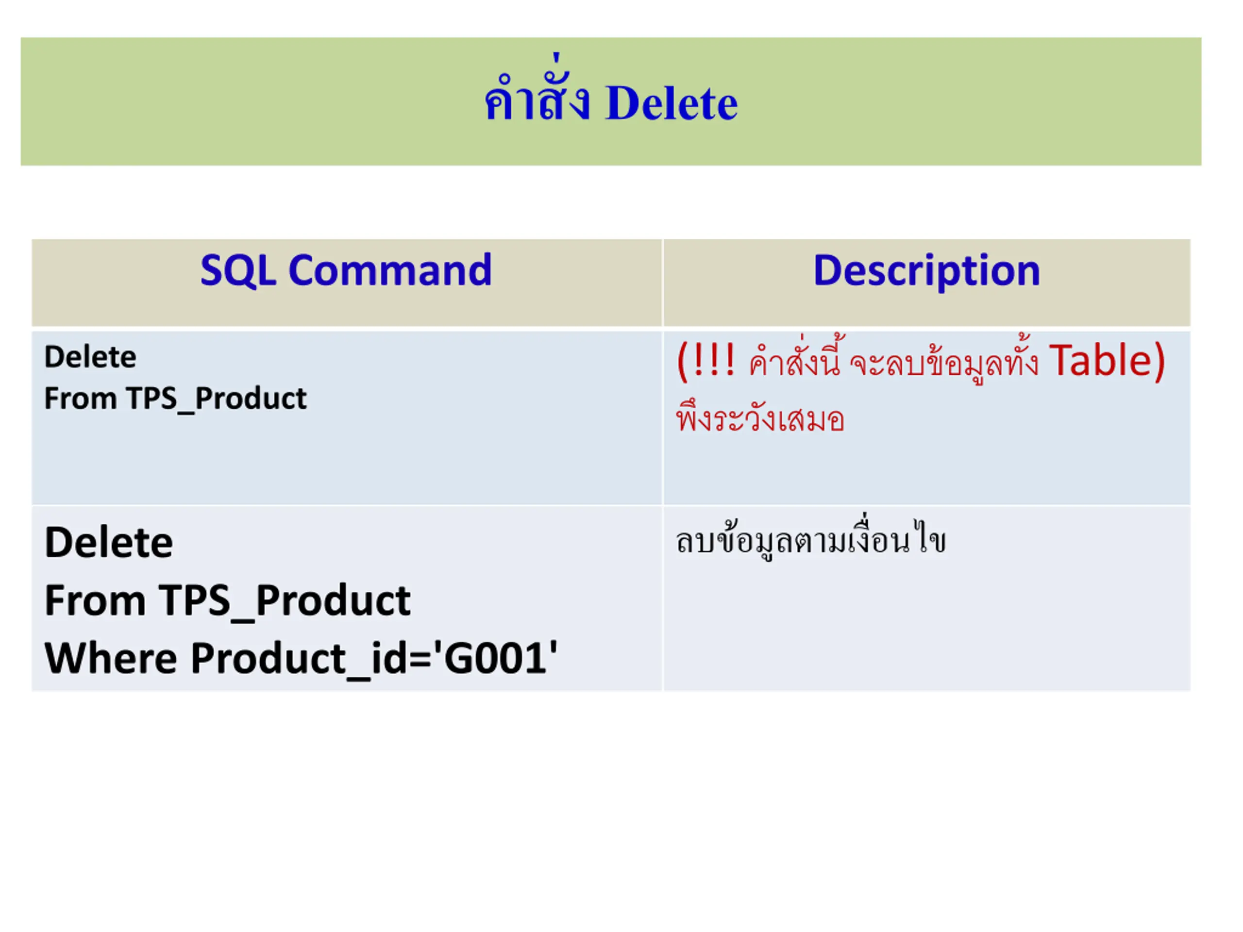 Delete SQL Command Description (!!! Table) Delete From TPS_Product Delete From TPS_Product Where Product_id='G001'