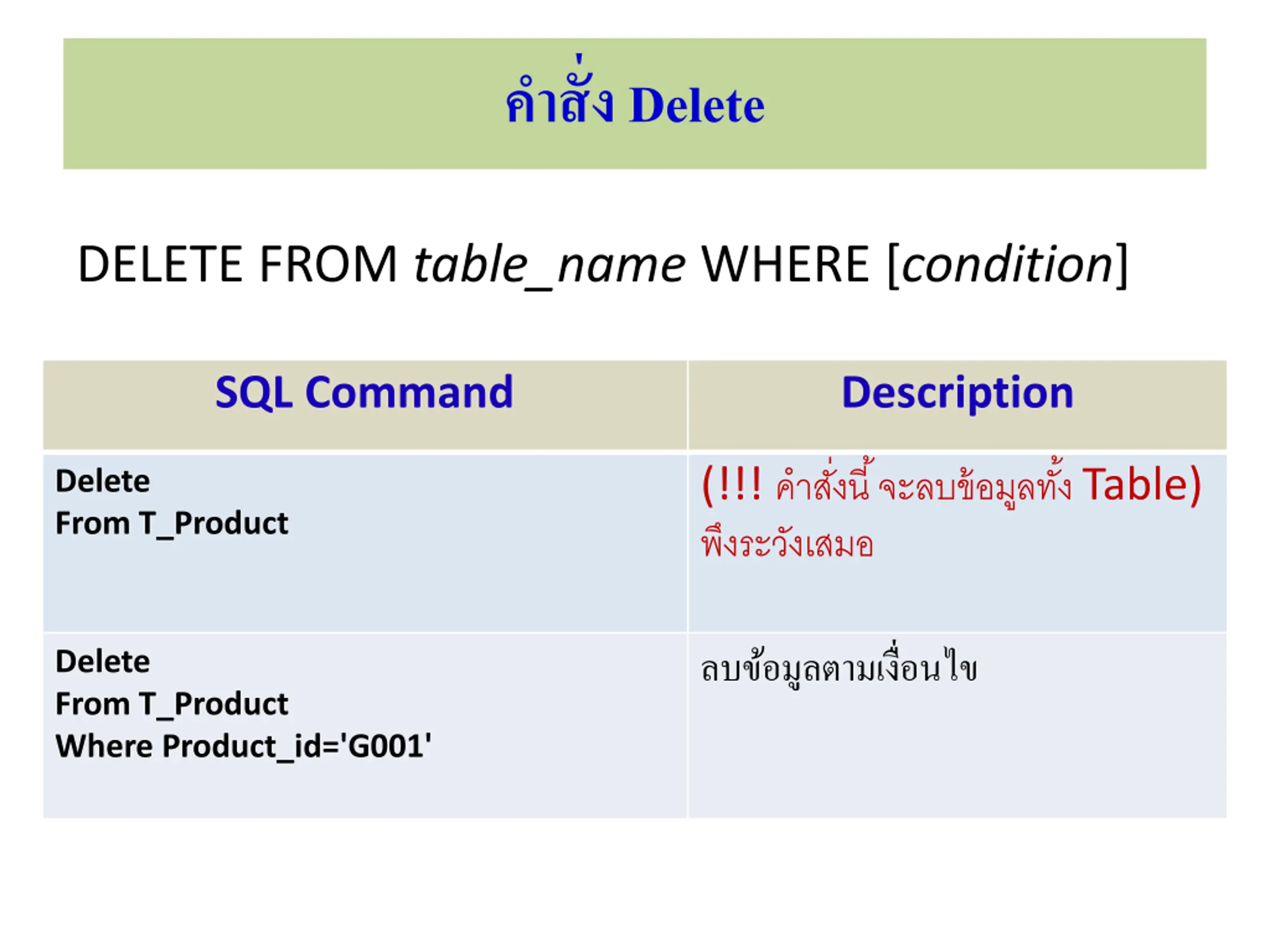 Delete DELETE FROM table_name WHERE [condition] SQL Command Description (!!! Table) Delete From T_Product Delete From T_Product Where Product_id='G001'