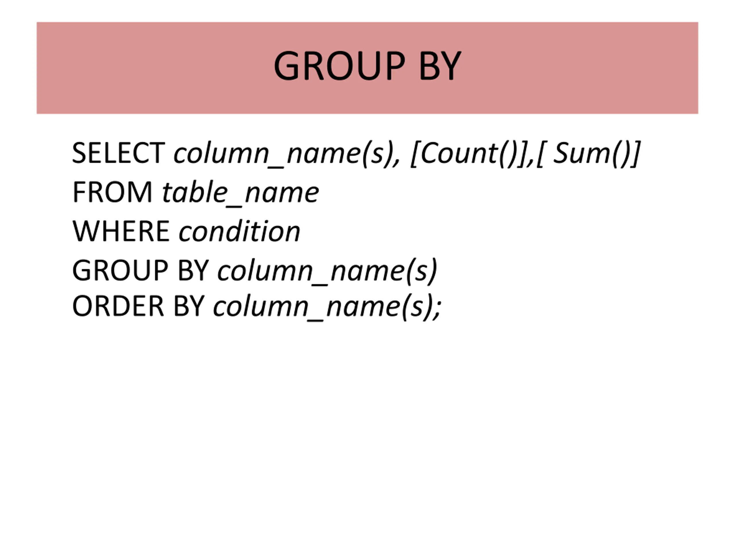 GROUP BY select Product_type_id,count(Product_id)as Count from T_Product group by Product_type_id Product_Type_Id PT001 PT002 PT004 PT006 PT008 PT009 Count 4 1 1 6 5 3 select Receipt_No,SUM(Total_Amt) as Sum from T_sales_detail group by Receipt_No Receipt_No F16012019G300001 F16012019G300002 F17012019G300001 F17012019G300002 Sum 222 280 92 170