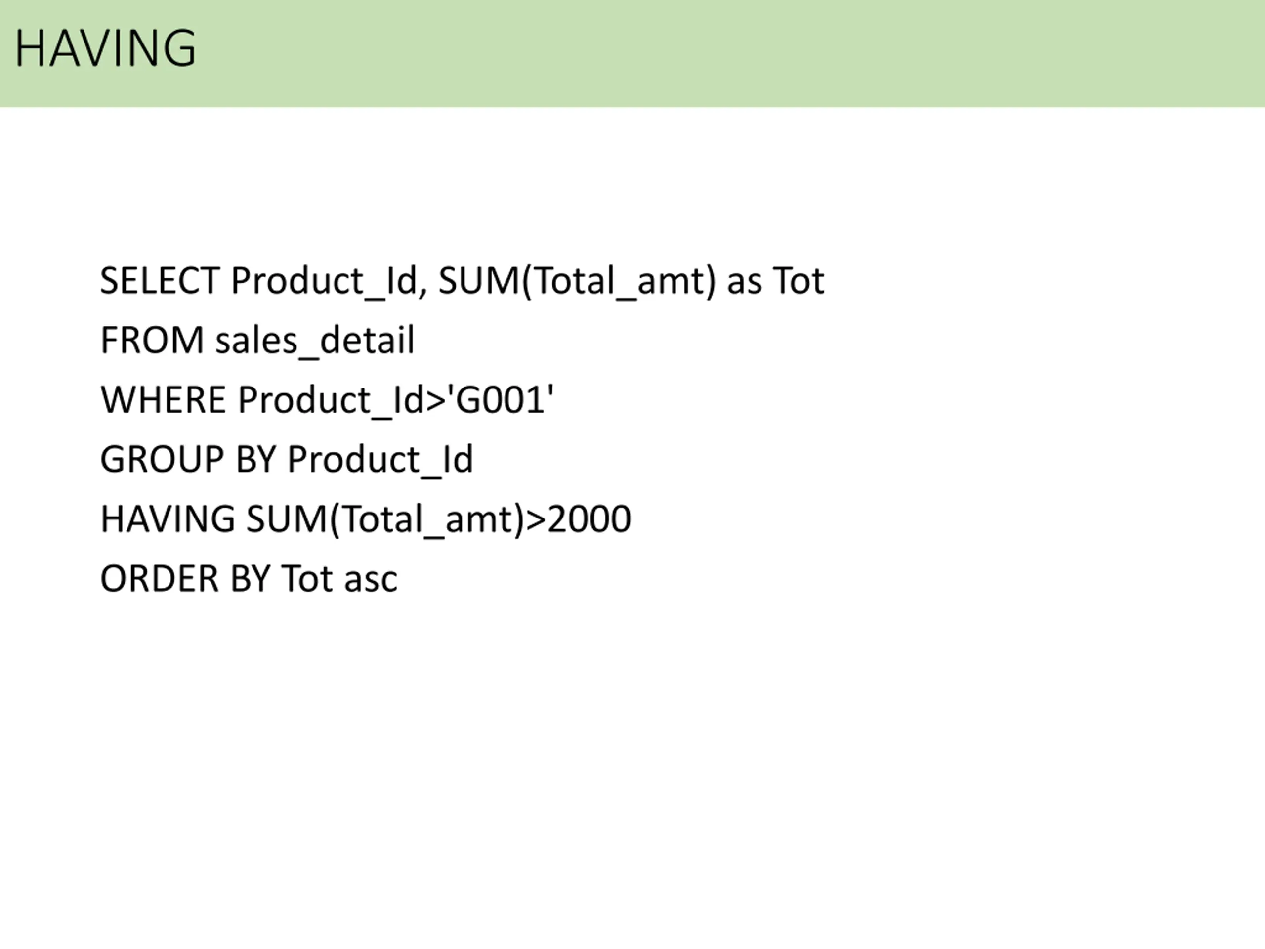 HAVING SELECT Product_Id, SUM(Total_amt) as Tot FROM sales_detail WHERE Product_Id>'G001' GROUP BY Product_Id HAVING SUM(Total_amt)>2000 ORDER BY Tot asc
