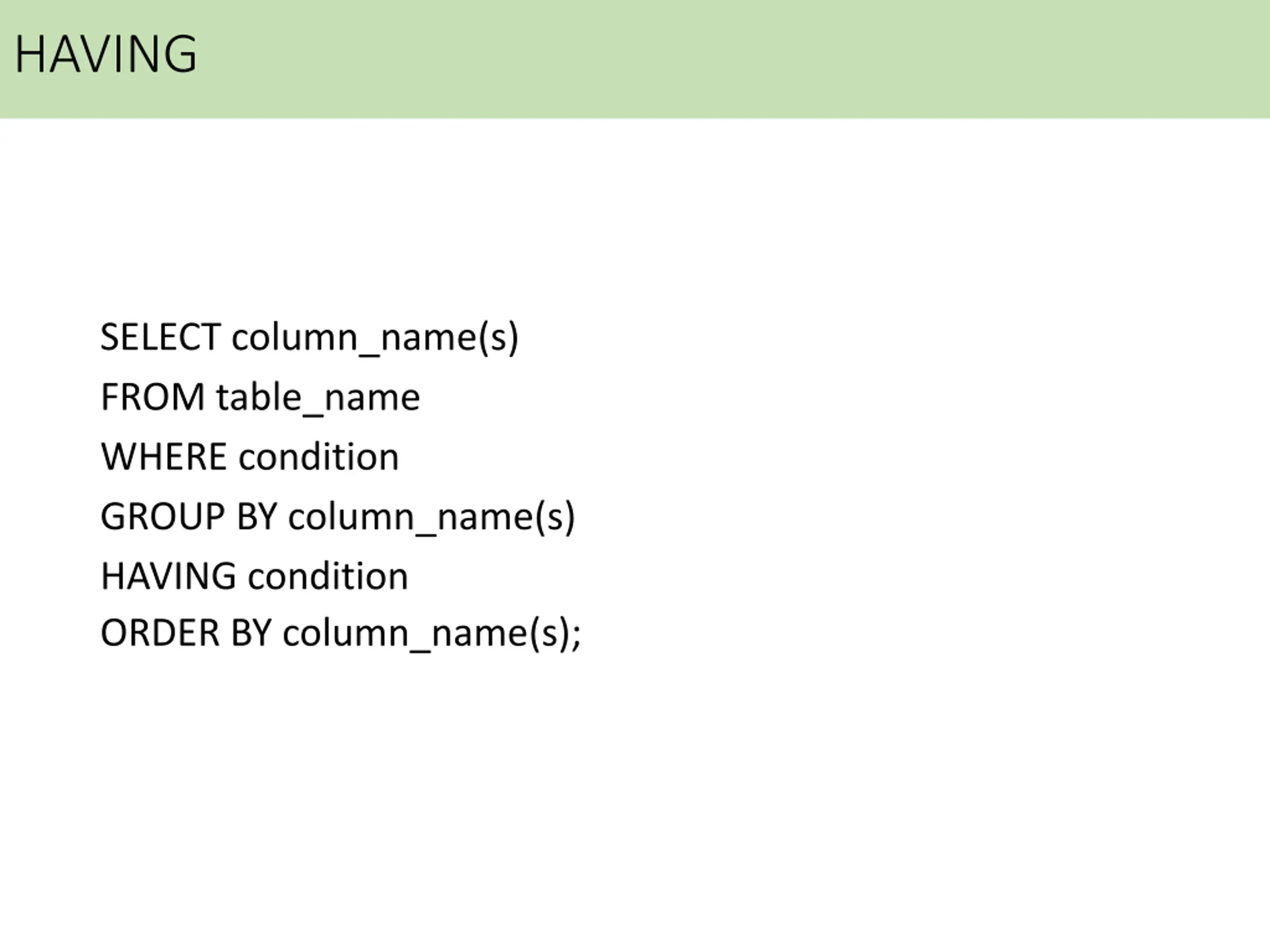HAVING SELECT column_name(s) FROM table_name WHERE condition GROUP BY column_name(s) HAVING condition ORDER BY column_name(s);