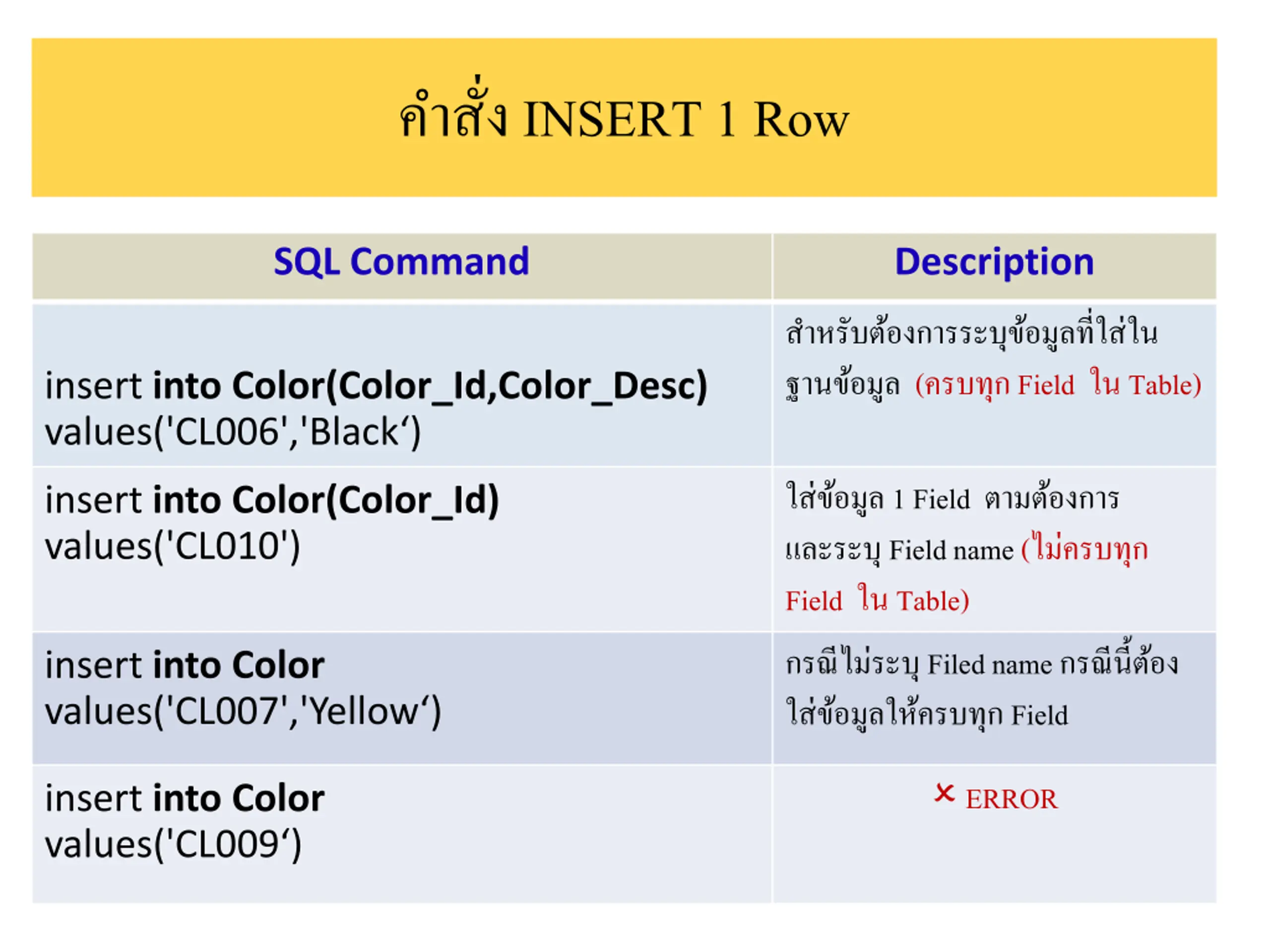 INSERT 1 Row SQL Command Description ( Field Table) insert into Color(Color_Id,Color_Desc) values('CL006','Black ) 1 Field Field name ( Field Table) Filed name Field insert into Color(Color_Id) values('CL010') insert into Color values('CL007','Yellow ) ERROR insert into Color values('CL009 )