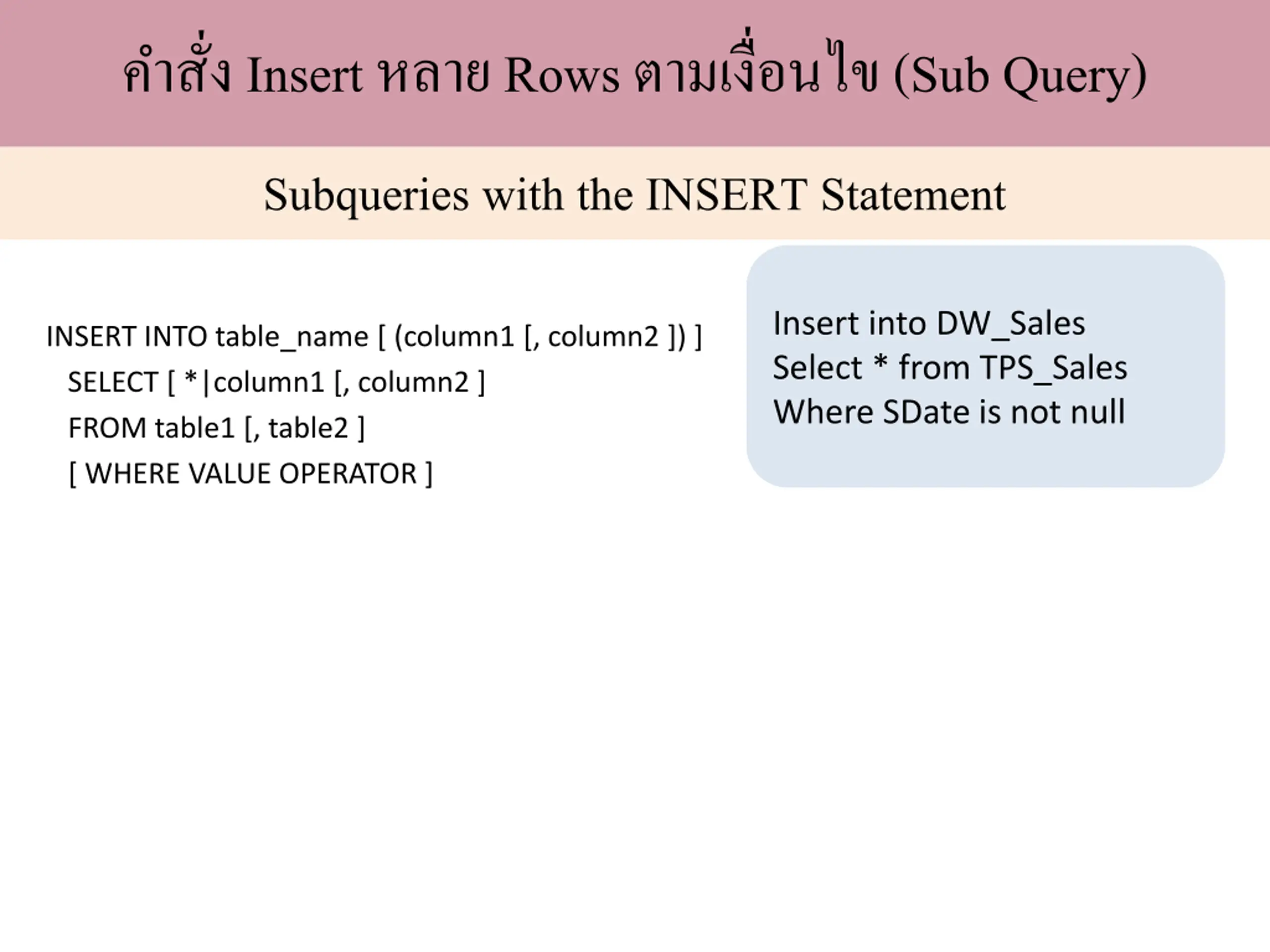 Insert Rows (Sub Query) Subqueries with the INSERT Statement Insert into DW_Sales Select * from TPS_Sales Where SDate is not null INSERT INTO table_name [ (column1 [, column2 ]) ] SELECT [ *|column1 [, column2 ] FROM table1 [, table2 ] [ WHERE VALUE OPERATOR ]