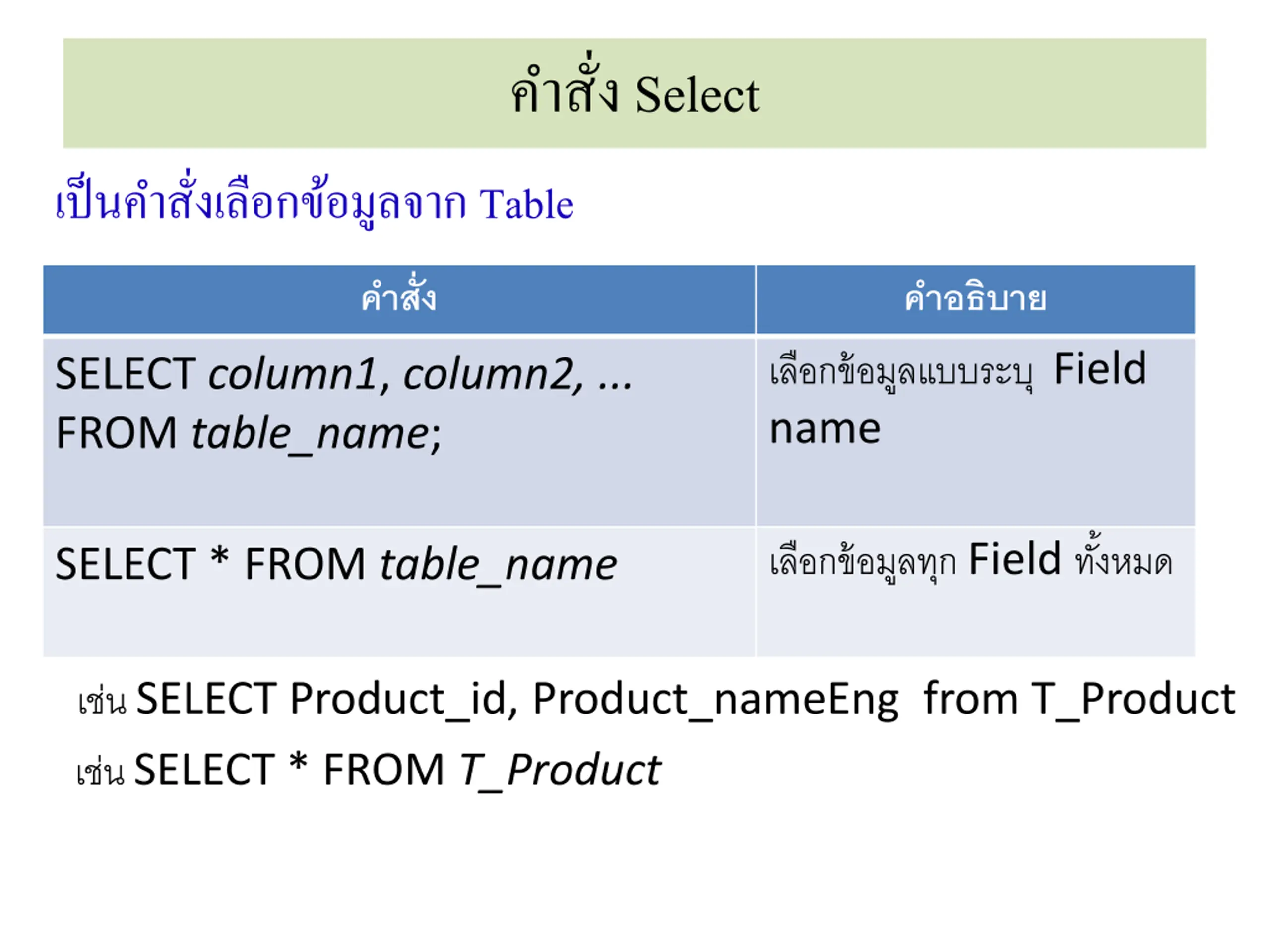 Select Table Field name SELECT column1, column2, ... FROM table_name; Field SELECT * FROM table_name SELECT Product_id, Product_nameEng from T_Product SELECT * FROM T_Product