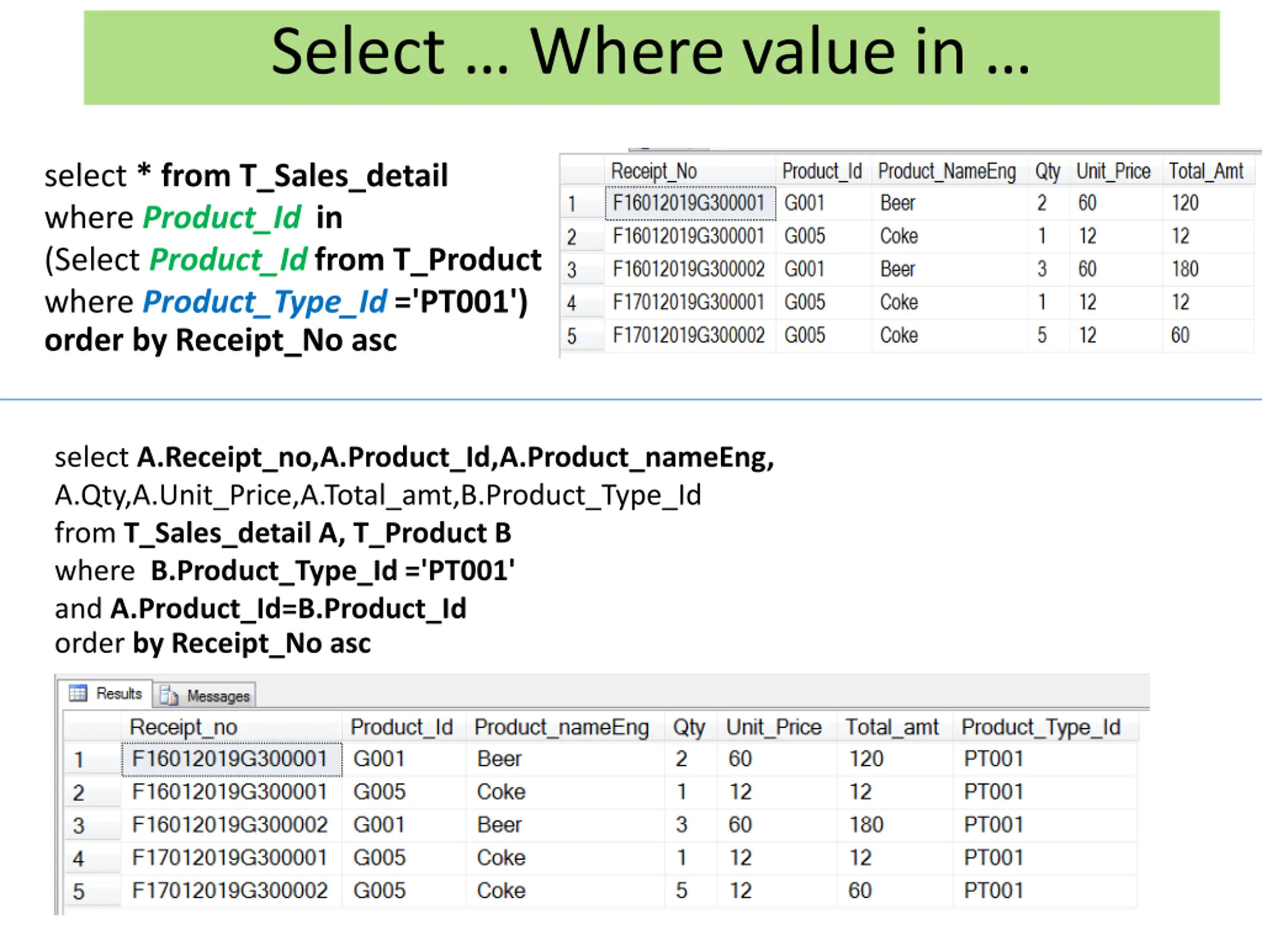 Select Where value in select * from T_Sales_detail where Product_Id in (Select Product_Id from T_Product where Product_Type_Id ='PT001') order by Receipt_No asc select A.Receipt_no,A.Product_Id,A.Product_nameEng, A.Qty,A.Unit_Price,A.Total_amt,B.Product_Type_Id from T_Sales_detail A, T_Product B where B.Product_Type_Id ='PT001' and A.Product_Id=B.Product_Id order by Receipt_No asc