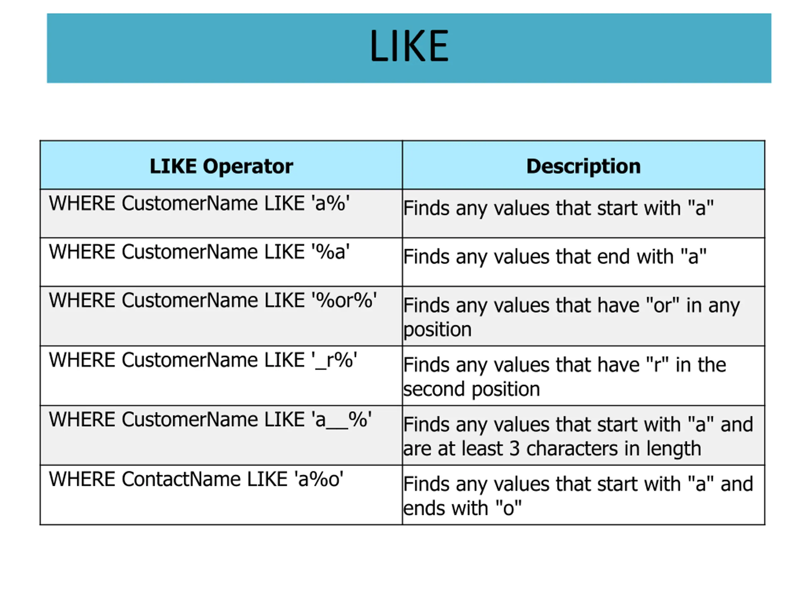 LIKE LIKE Operator Description WHERE CustomerName LIKE 'a%' Finds any values that start with "a" WHERE CustomerName LIKE '%a' Finds any values that end with "a" WHERE CustomerName LIKE '%or%' Finds any values that have "or" in any position WHERE CustomerName LIKE '_r%' Finds any values that have "r" in the second position WHERE CustomerName LIKE 'a__%' Finds any values that start with "a" and are at least 3 characters in length WHERE ContactName LIKE 'a%o' Finds any values that start with "a" and ends with "o"