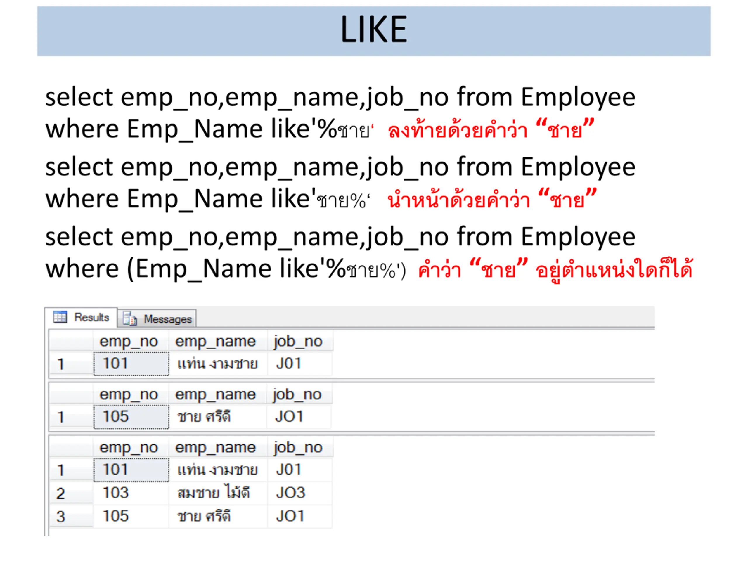 And, Or, Not selectProduct_Id,Product_NameThai, Unit_Price,Product_Type_Id fromT_Product whereUnit_Price>50 orProduct_Type_Id='PT006' select Product_Id,Product_NameThai, Unit_Price,Product_Type_Id from T_Product where Unit_Price >50 and Product_Type_Id='PT006' Product_Id G001 G002 G003 G004 G006 G007 G008 G009 G011 G012 G013 G014 G015 G016 G017 G018 G019 Product_NameThai Unit_Price Product_Type_Id PT001 PT009 PT006 PT006 PT008 PT006 PT009 PT006 PT002 PT006 PT004 PT008 PT006 PT008 PT009 PT008 PT008 60 200 20 10 Product_Id Product_NameThai G012 G015 Unit_Price Product_Type_Id PT006 PT006 190 60 20000 40 150 20 200 190 290 3000 60 2000 60 30000 20000