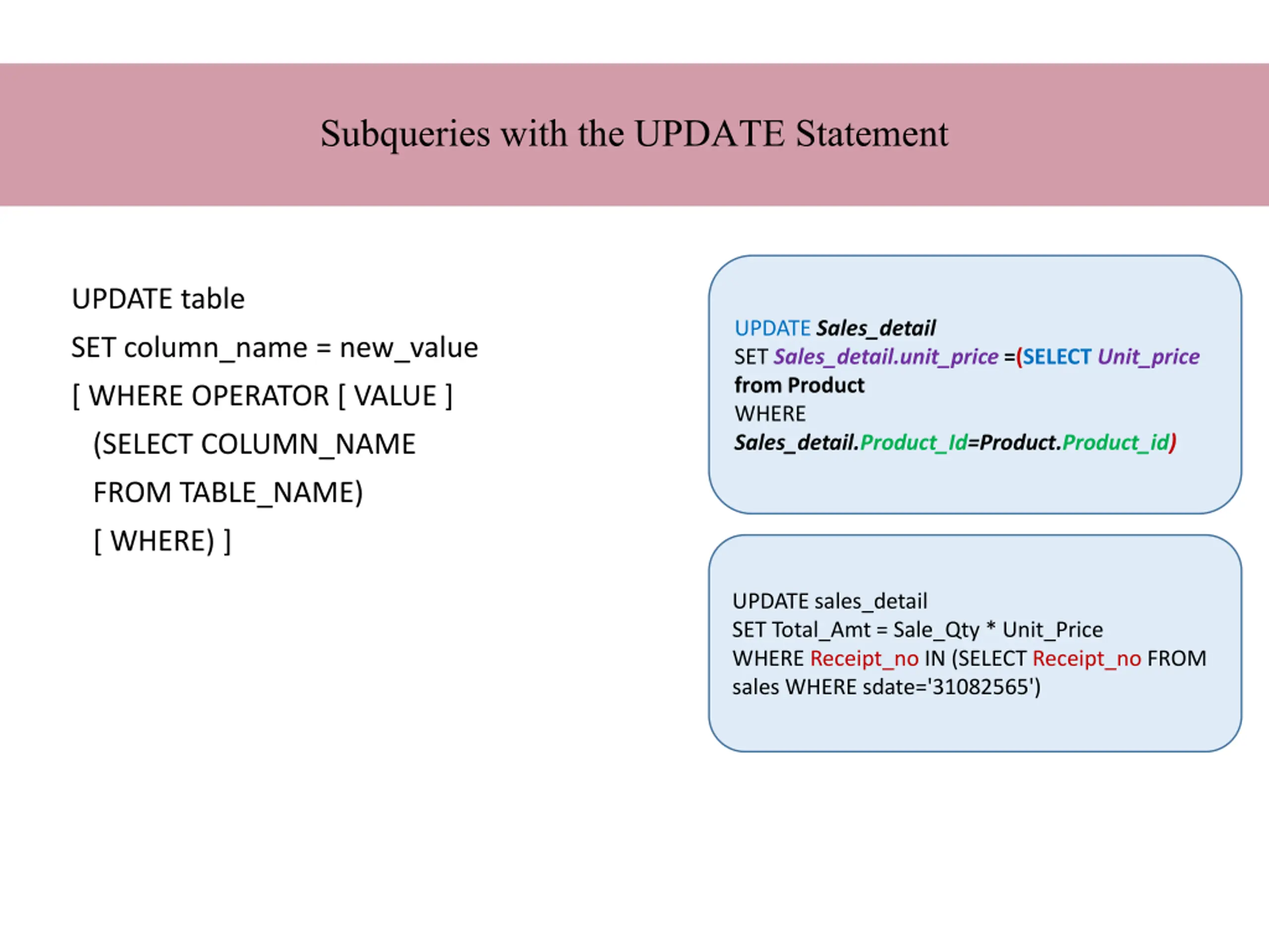 Subqueries with the UPDATE Statement UPDATE table UPDATE Sales_detail SET Sales_detail.unit_price=(SELECT Unit_price from Product WHERE Sales_detail.Product_Id=Product.Product_id) SET column_name = new_value [ WHERE OPERATOR [ VALUE ] (SELECT COLUMN_NAME FROM TABLE_NAME) [ WHERE) ] UPDATE sales_detail SET Total_Amt = Sale_Qty * Unit_Price WHERE Receipt_no IN (SELECT Receipt_no FROM sales WHERE sdate='31082565')