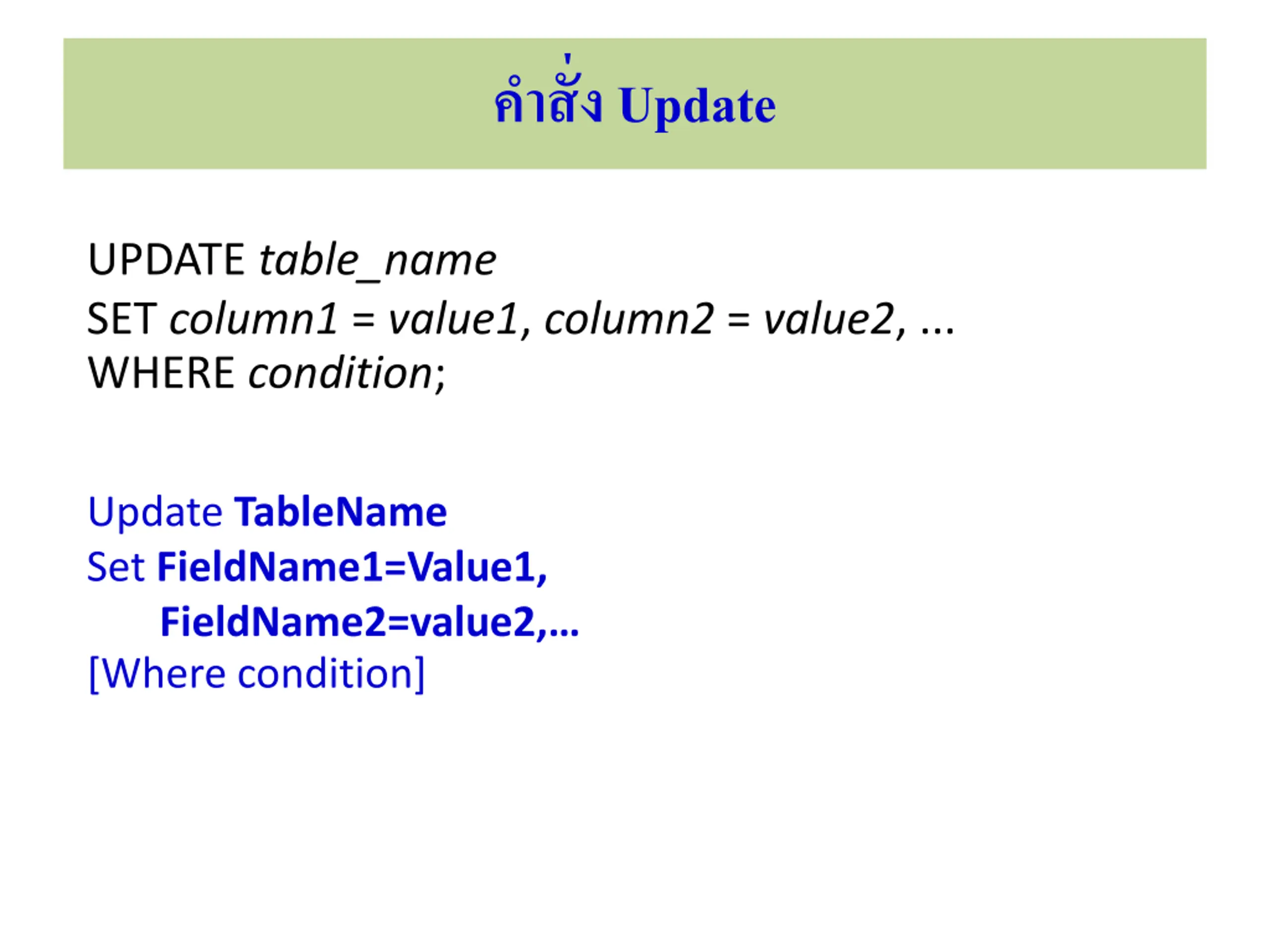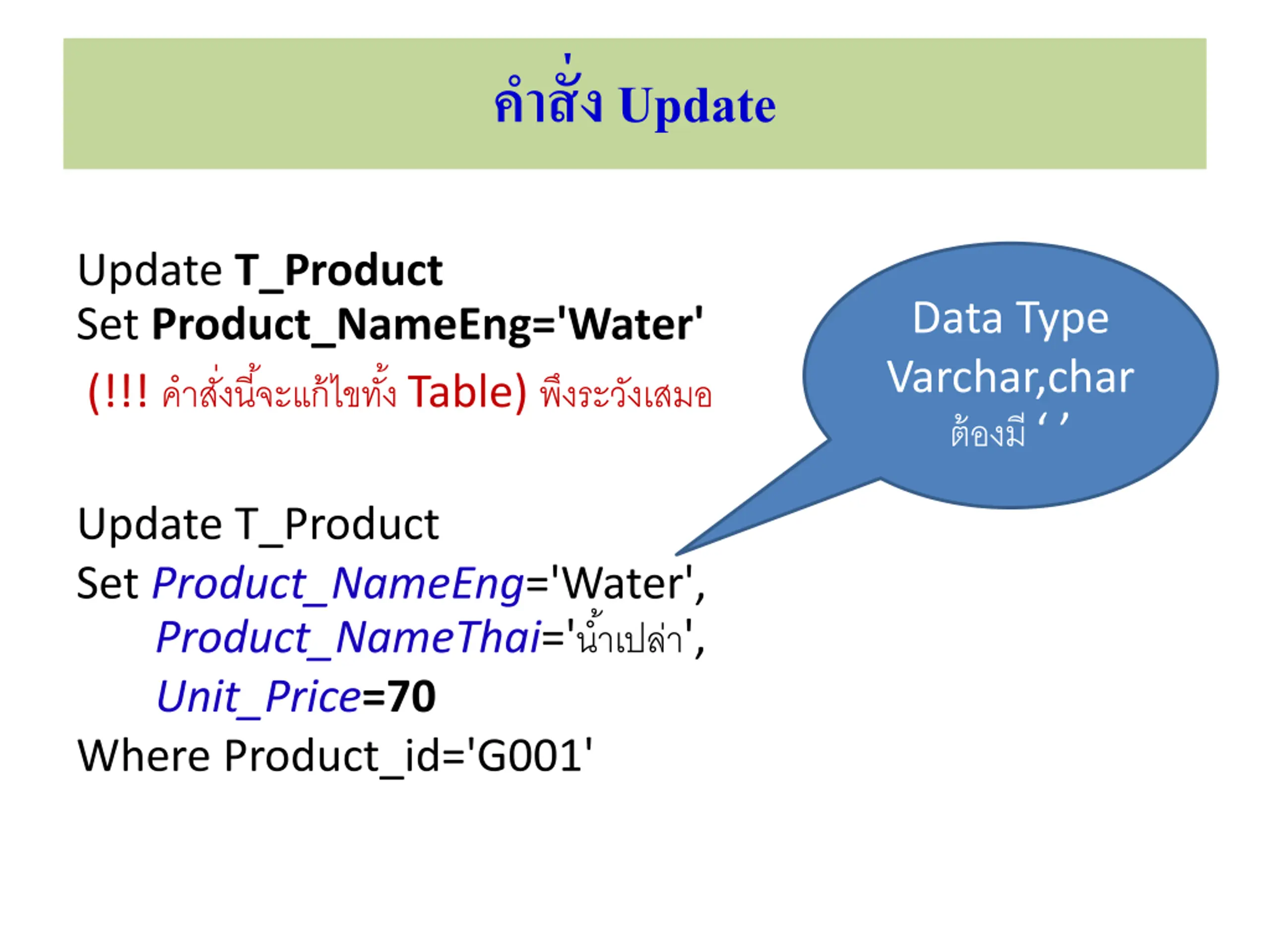 Update Update T_Product Set Product_NameEng='Water' (!!! Table) Data Type Varchar,char Update T_Product Set Product_NameEng='Water', Product_NameThai=' ', Unit_Price=70 Where Product_id='G001'