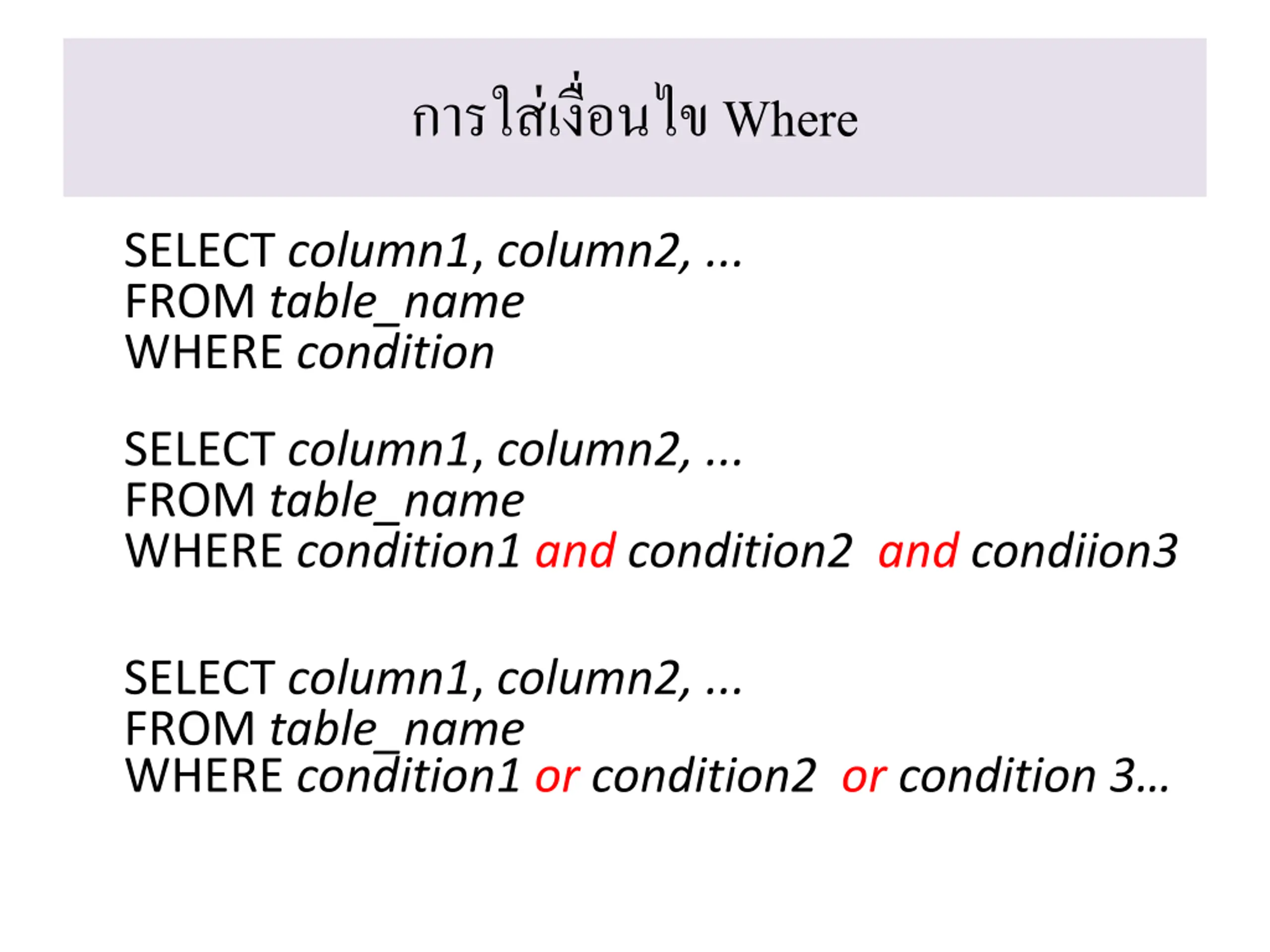 Where SELECT column1, column2, ... FROM table_name WHERE condition SELECT column1, column2, ... FROM table_name WHERE condition1 and condition2 and condiion3 SELECT column1, column2, ... FROM table_name WHERE condition1 or condition2 or condition 3