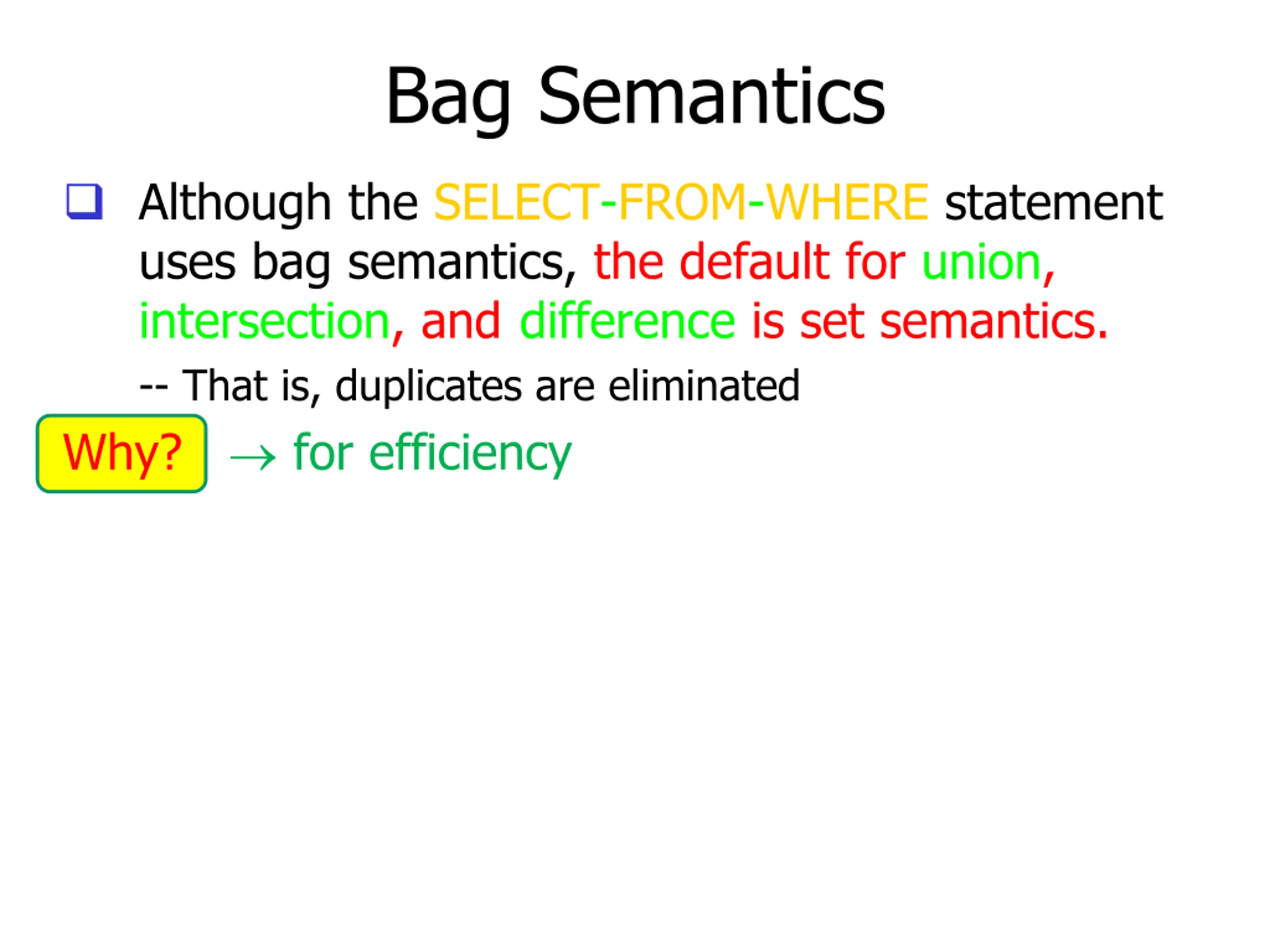 Bag Semantics Although the SELECT-FROM-WHERE statement uses bag semantics, the default for union, intersection, and difference is set semantics. -- That is, duplicates are eliminated Why? for efficiency